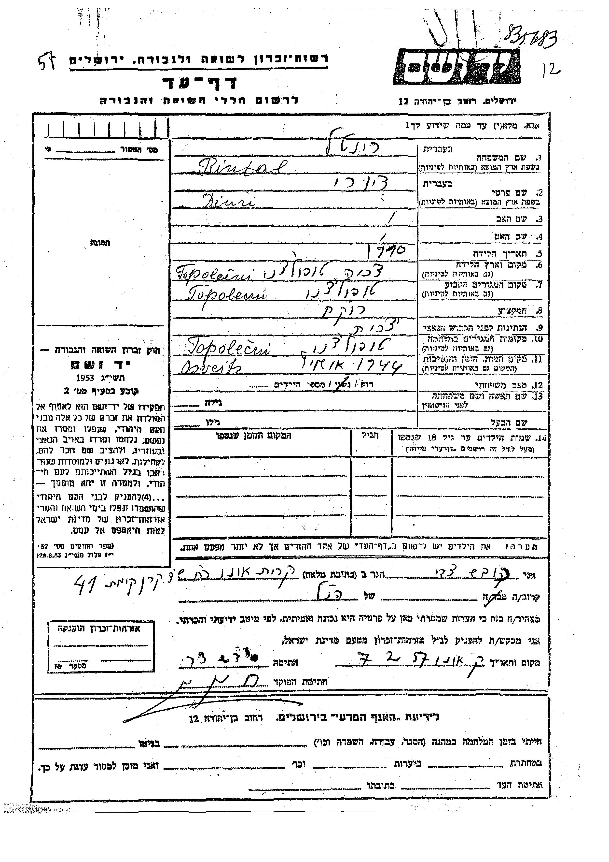 Яд Вашем - Листы свидетельских показаний Мемориального фонда