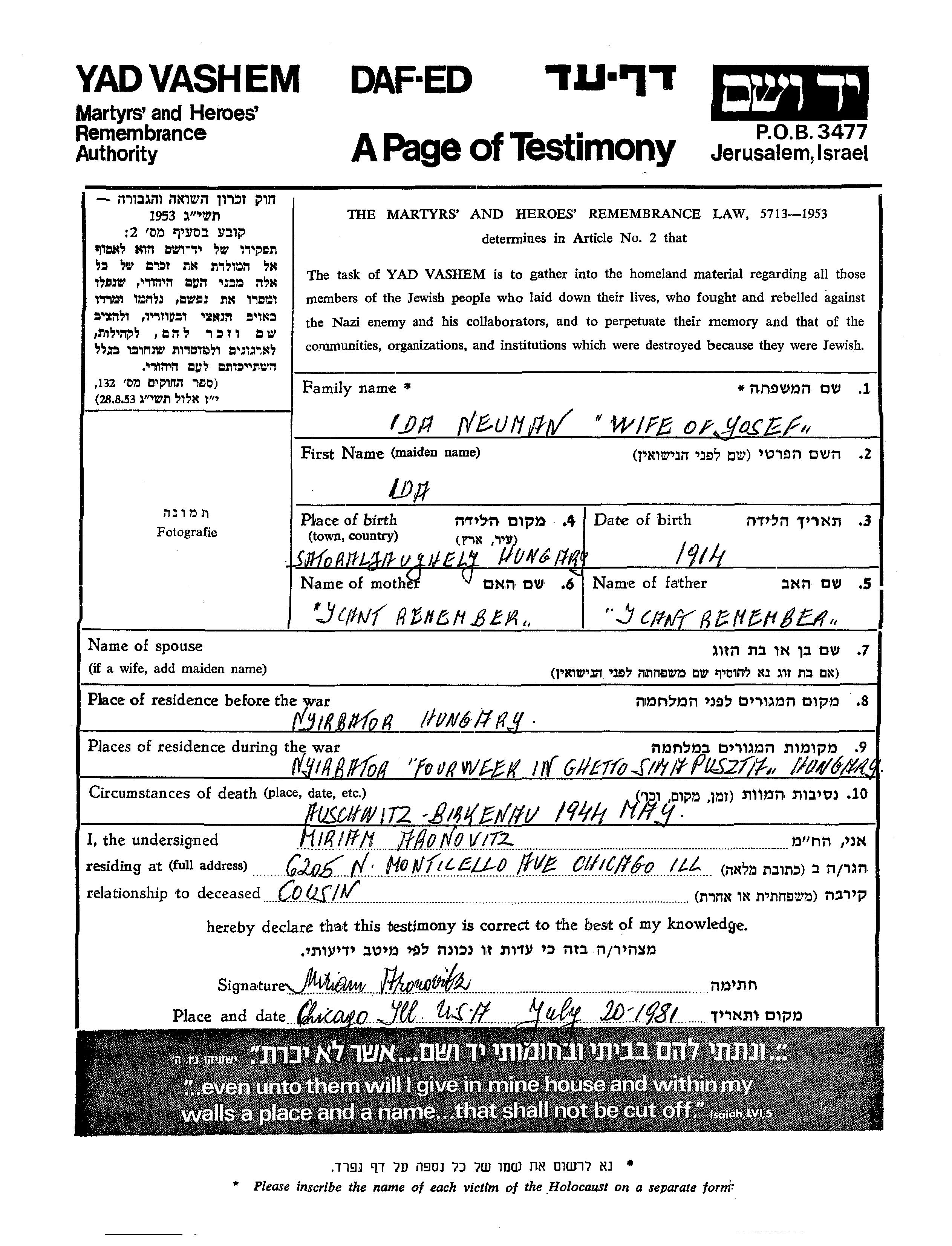 Нойман Ида 1914 Ньирбатор, Венгрия Лист свидетельских показаний