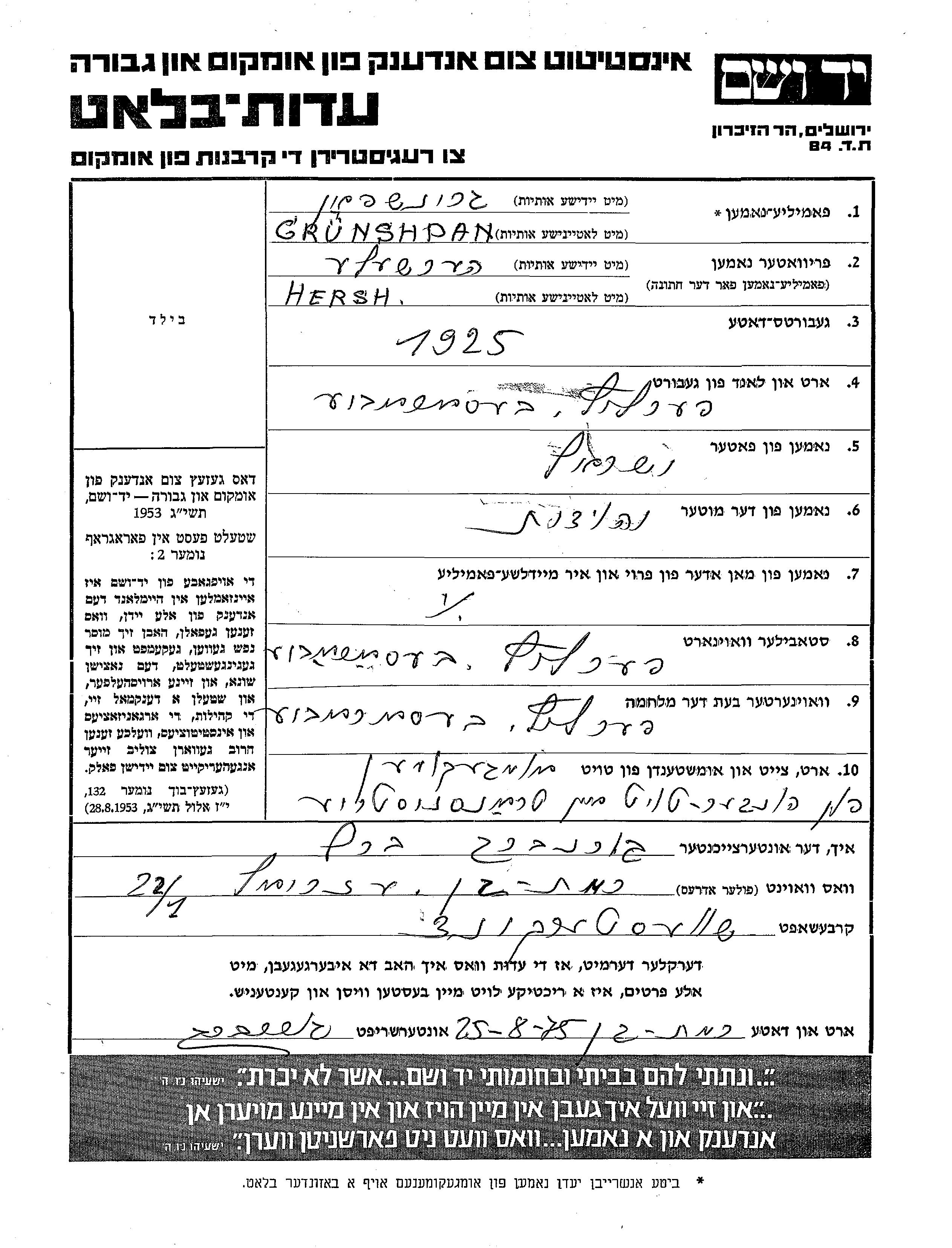 Герш Грюншпан, место рождения: Перлиц, Румыния. Отец: Исраэль, mать:Иегудит. Место жительства до войны: Перлиц, Румыния. Место во время войны: Перлиц, Румыния.