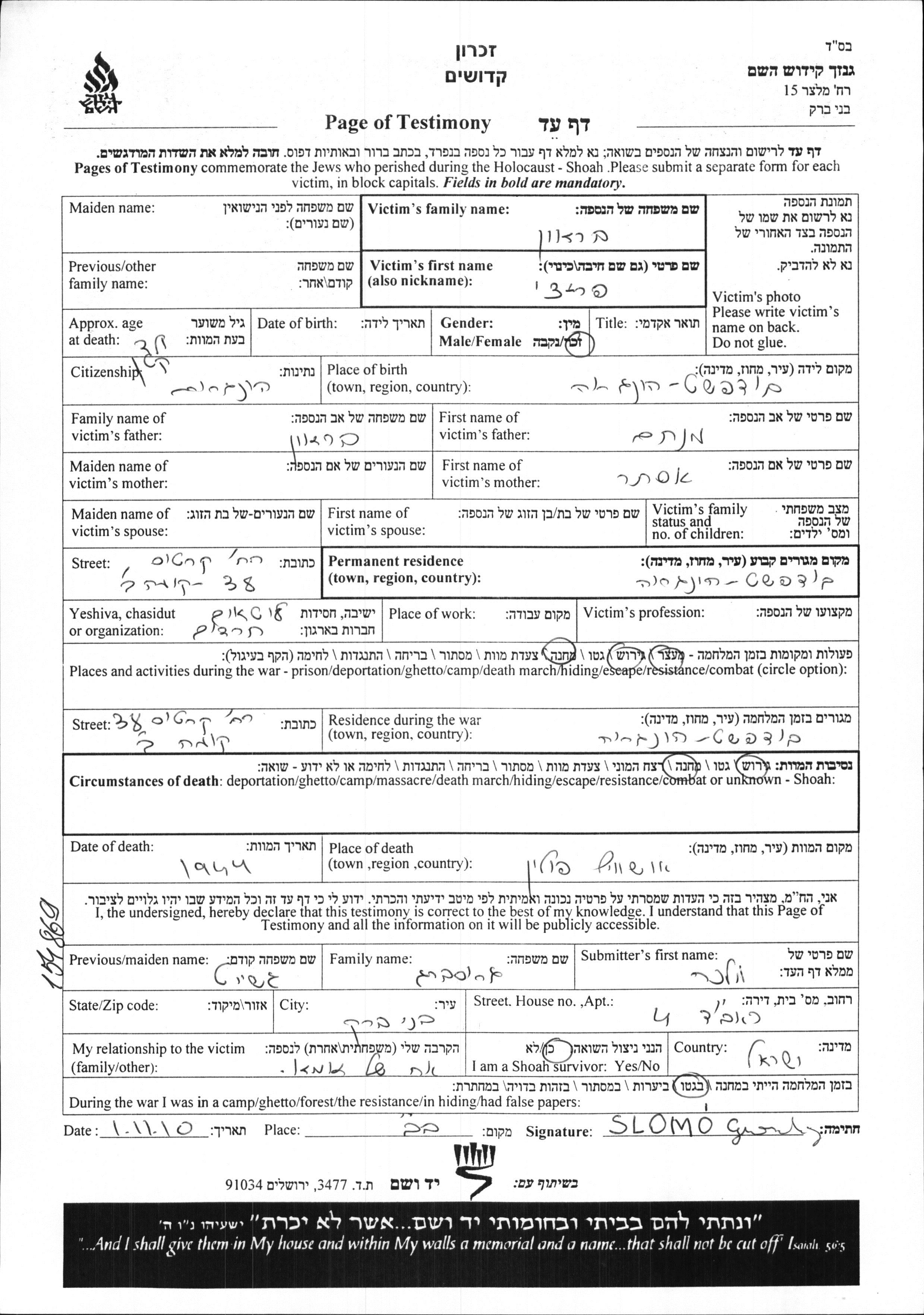 Яд Вашем - Листы свидетельских показаний Мемориального фонда