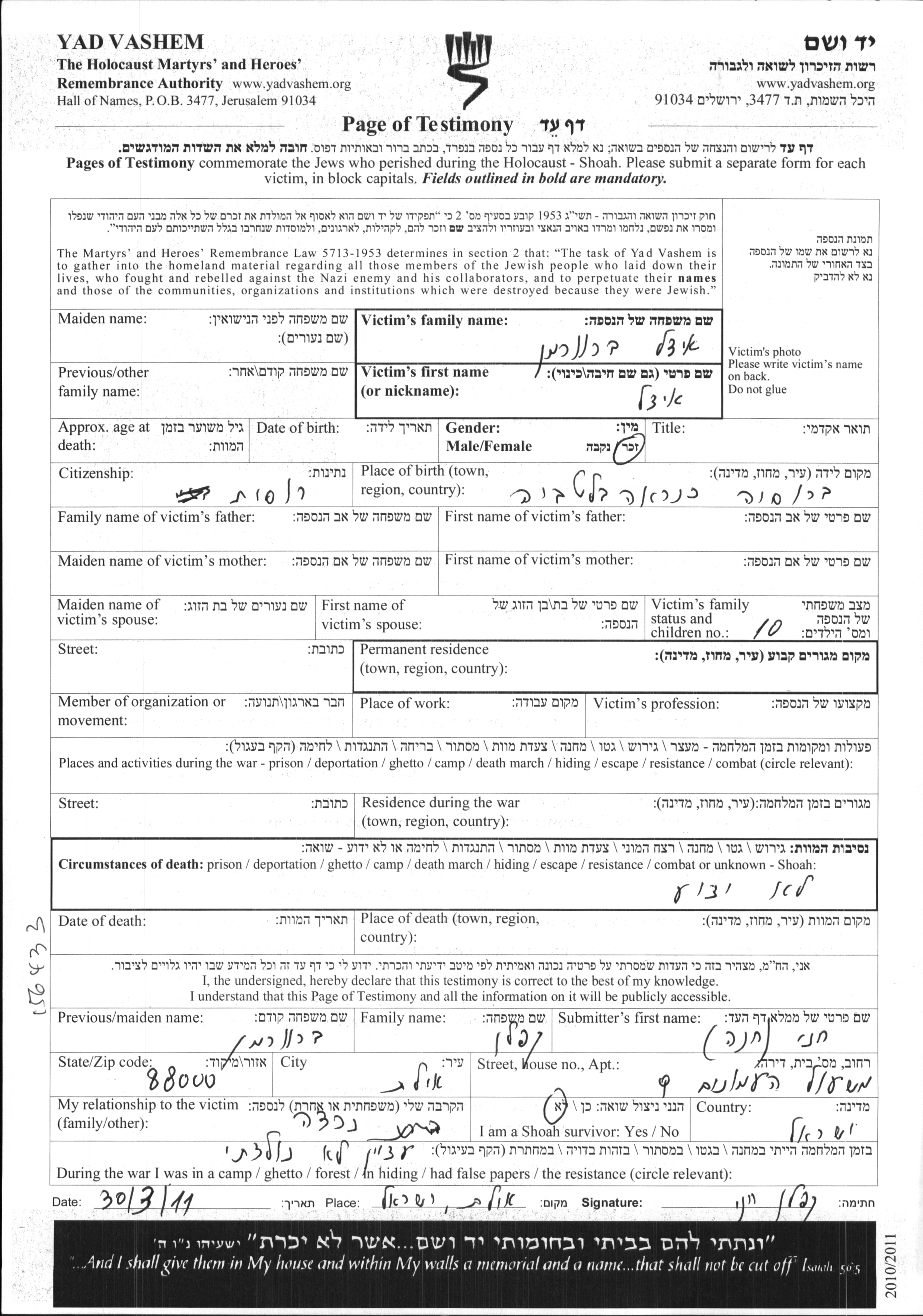 Яд Вашем - Листы свидетельских показаний Мемориального фонда