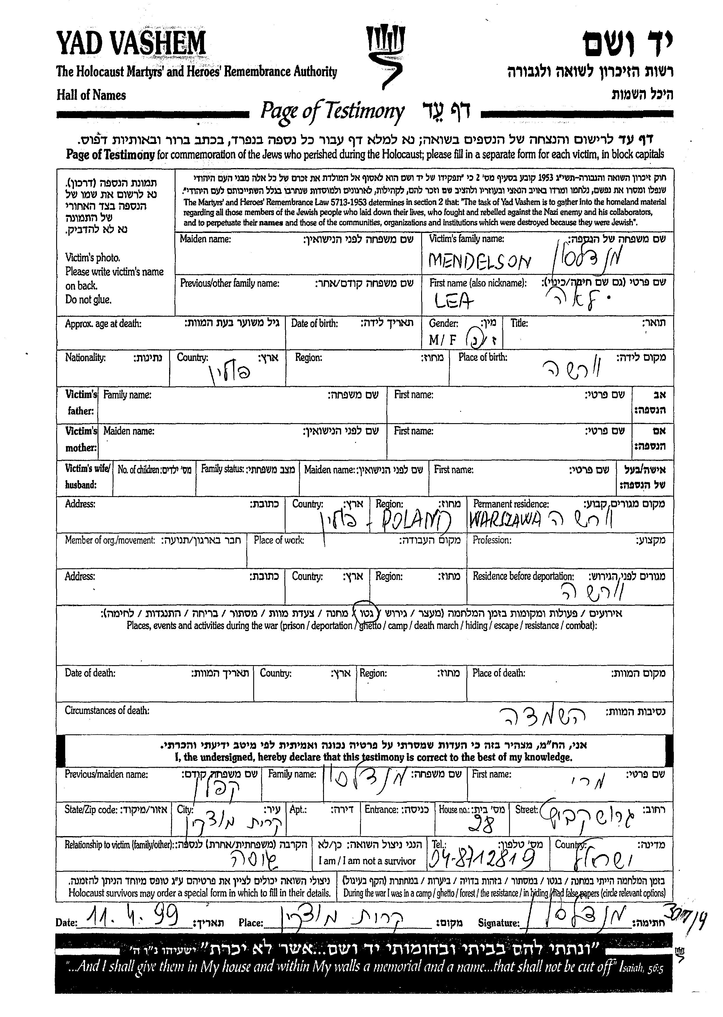 Мендельсон Лея Варшава, Польша Лист свидетельских показаний