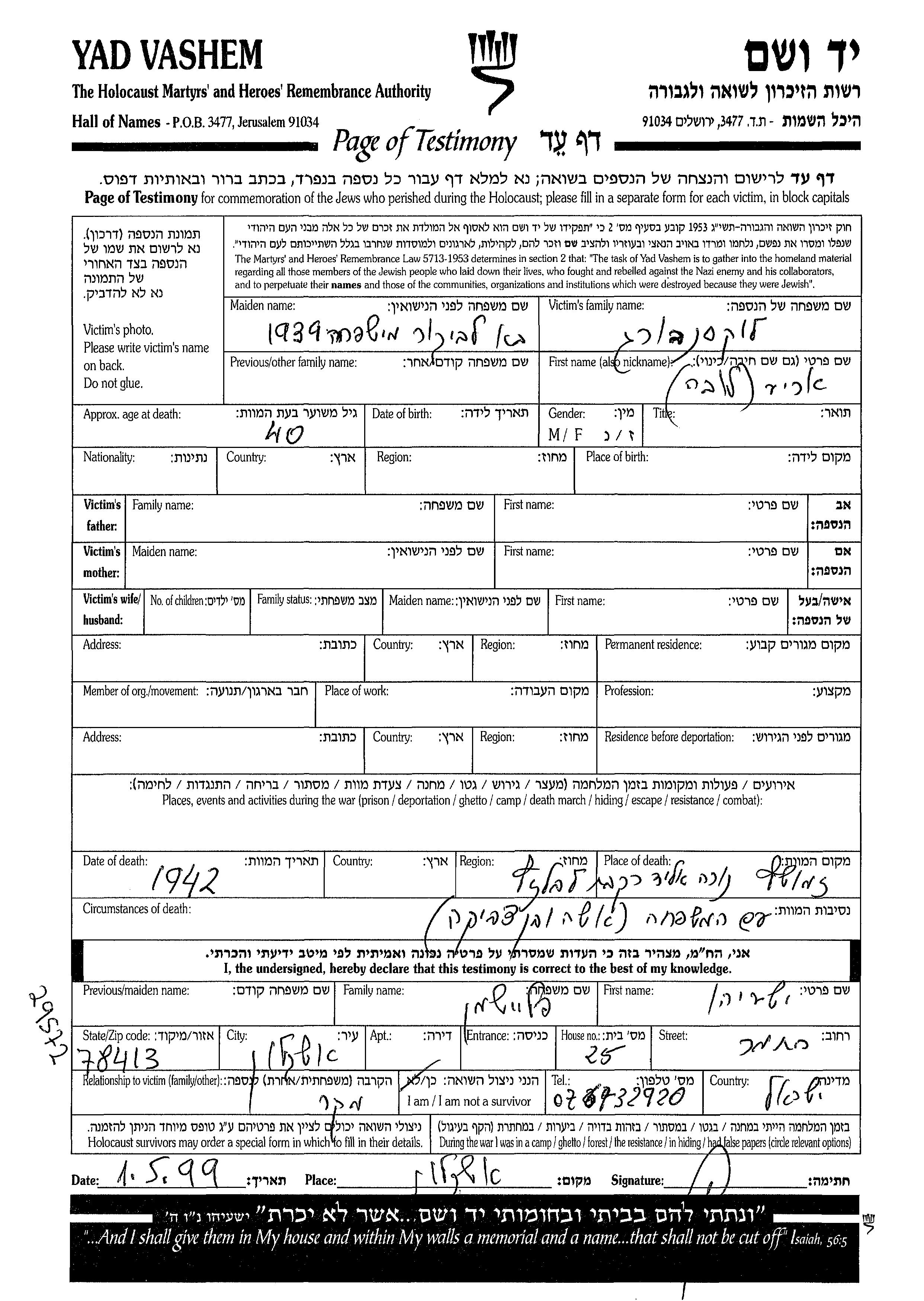 Яд Вашем - Листы свидетельских показаний Мемориального фонда