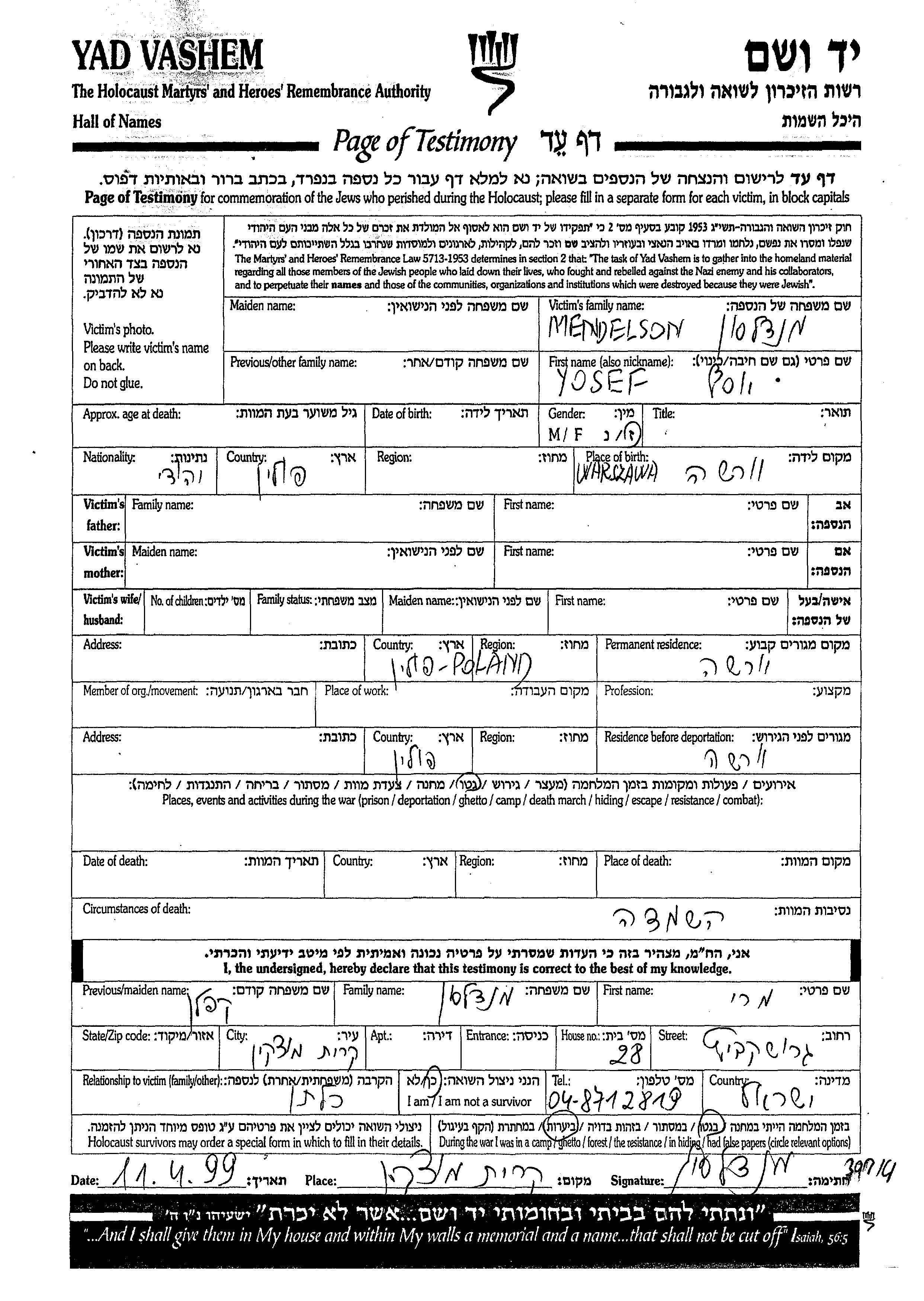 Мендельсон Иосеф Варшава, Польша Лист свидетельских показаний