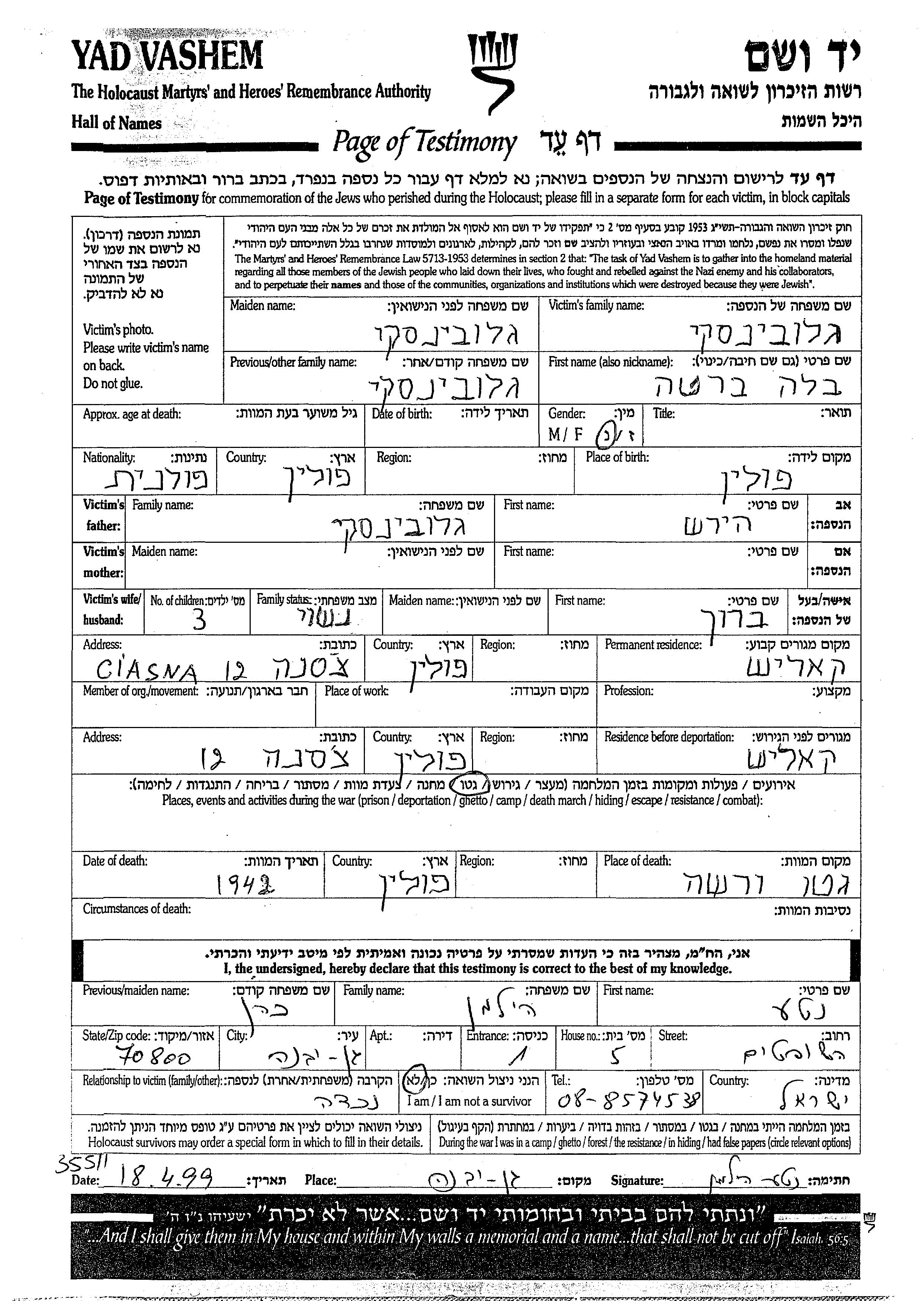 Гловински Бела Берта Калиш, Польша Лист свидетельских показаний