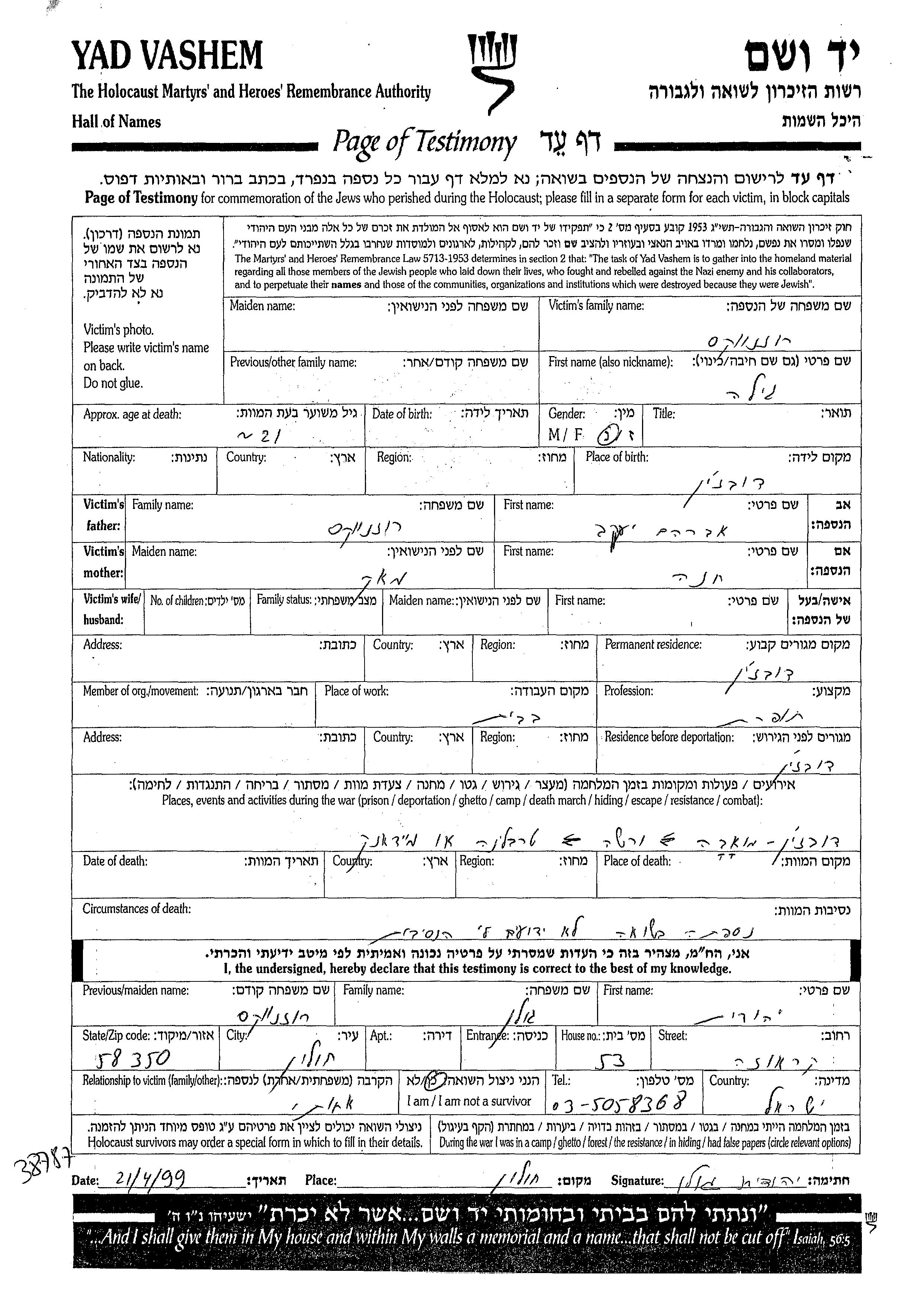 Яд Вашем - Листы свидетельских показаний Мемориального фонда