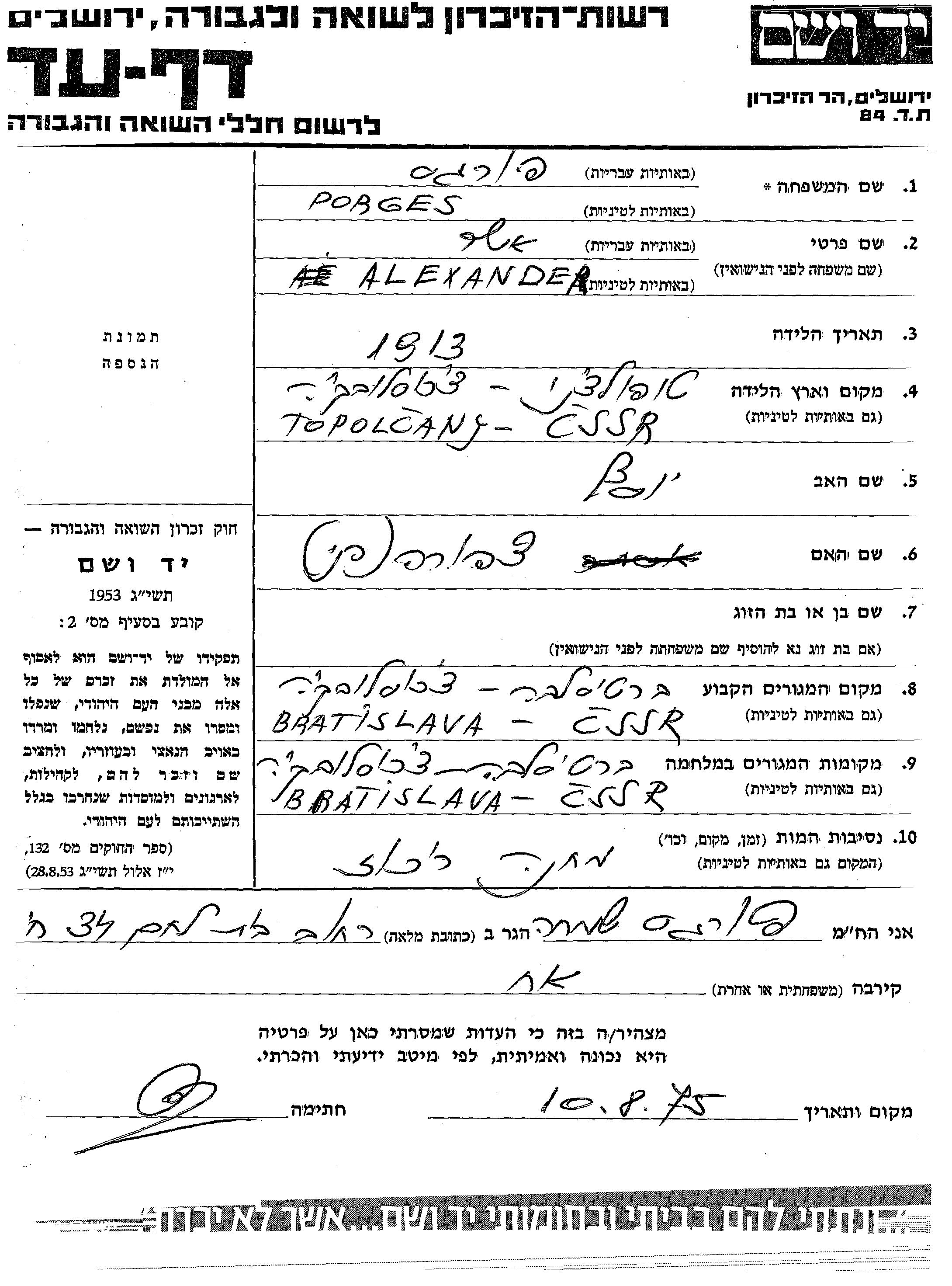 Поргес Александер Ашер 1913 Братислава, Чехословакия Лист свидетельских показаний