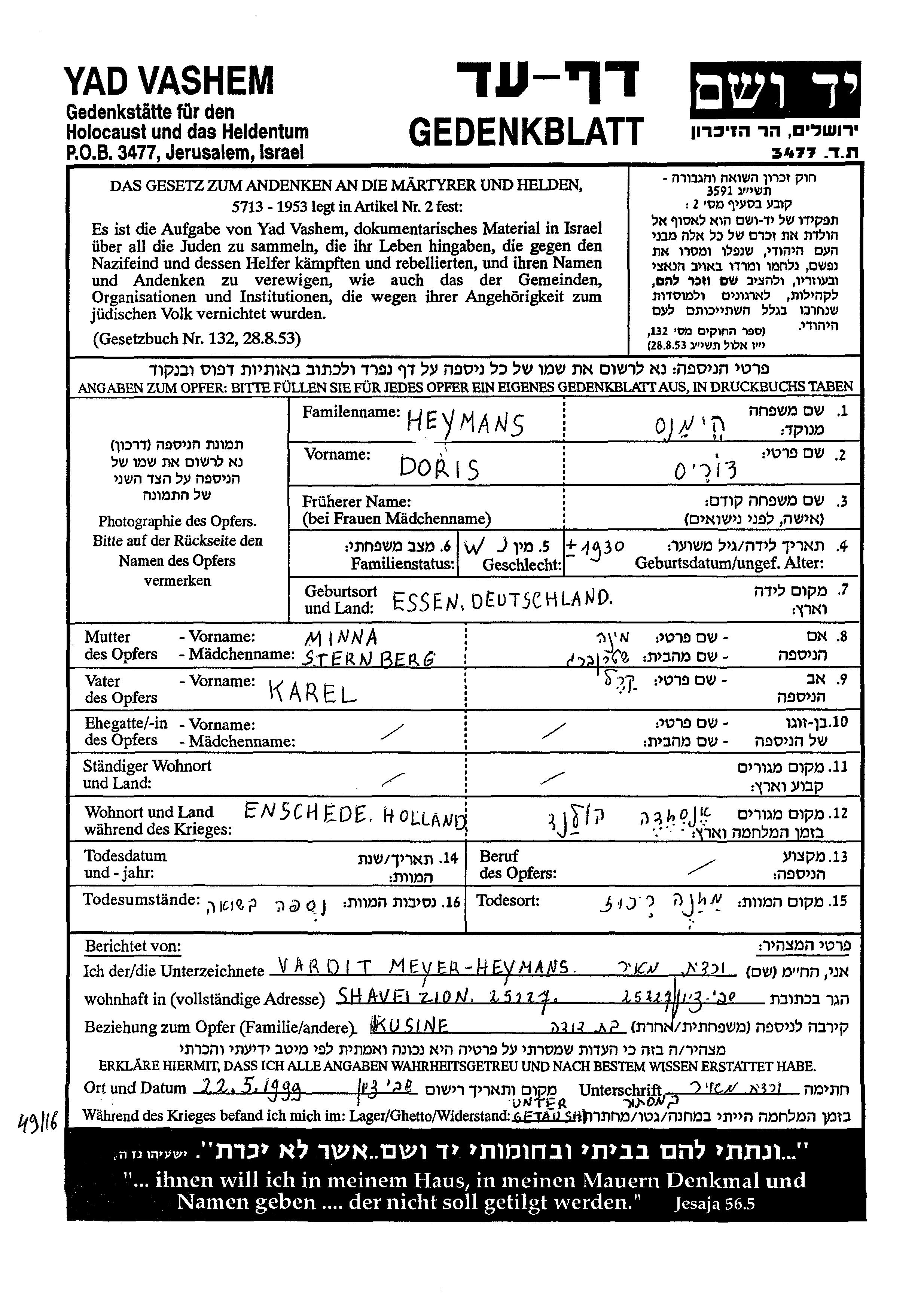 Хейманс Дорис 1931 Эссен, Германия Список уничтоженных евреев из Нидерландов