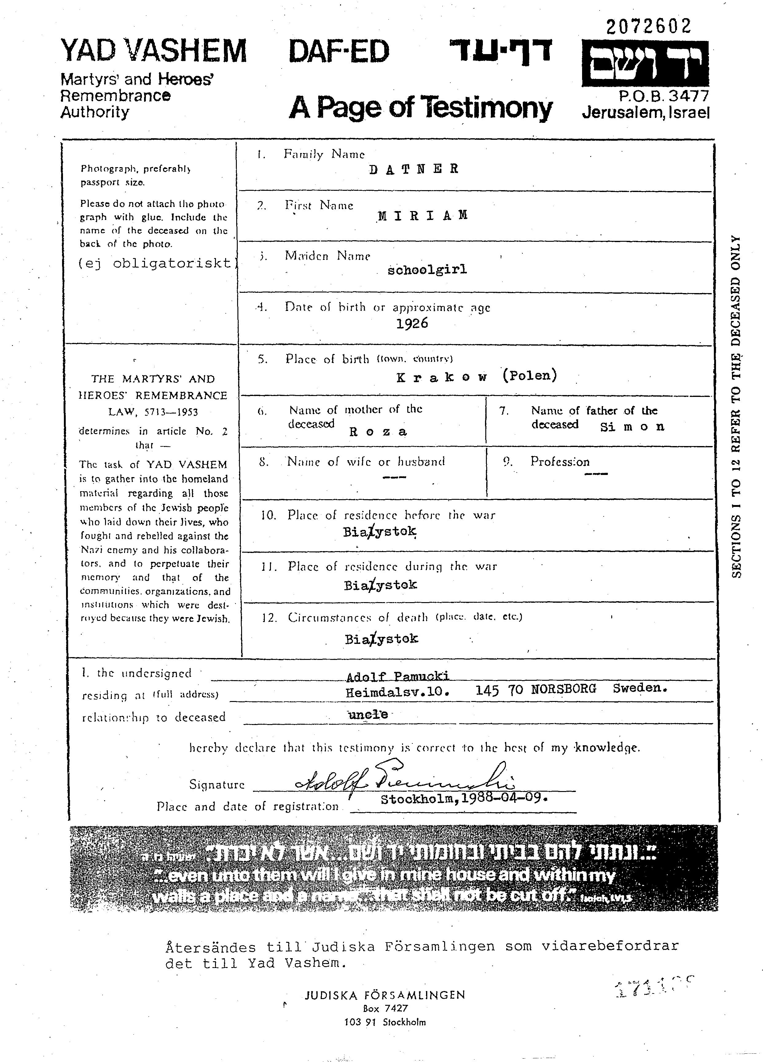 Датнер Мирьям 1926 Белосток, Польша Лист свидетельских показаний