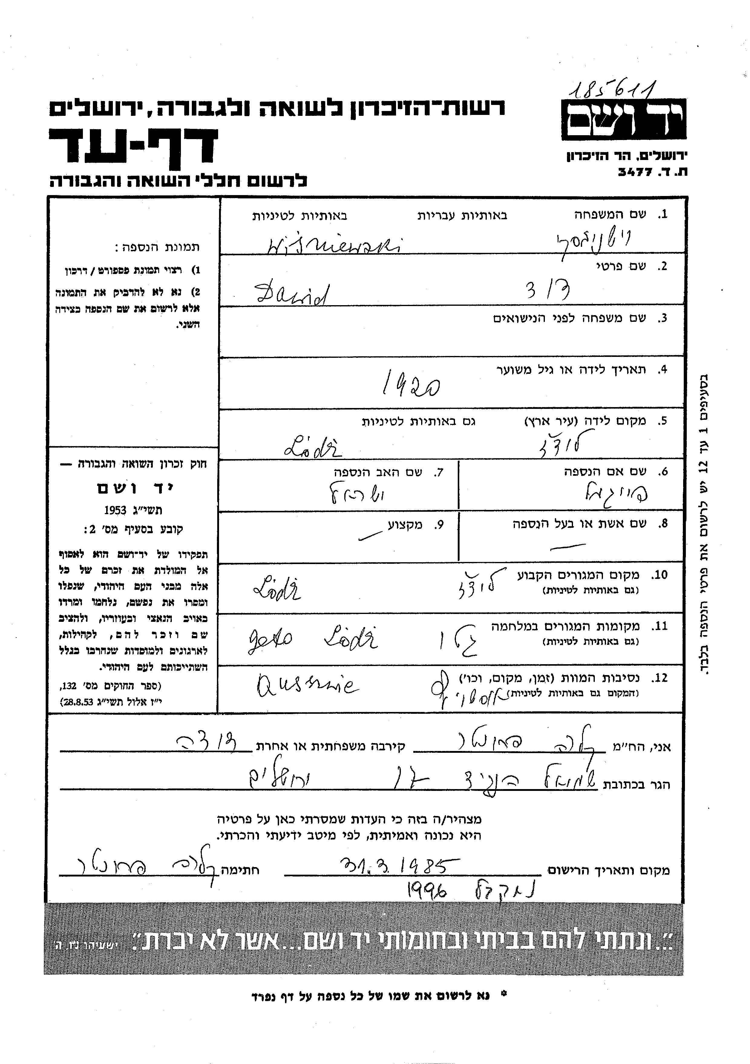 Висневски Давид Авраам 1923 Лодзь, Польша Лист свидетельских показаний