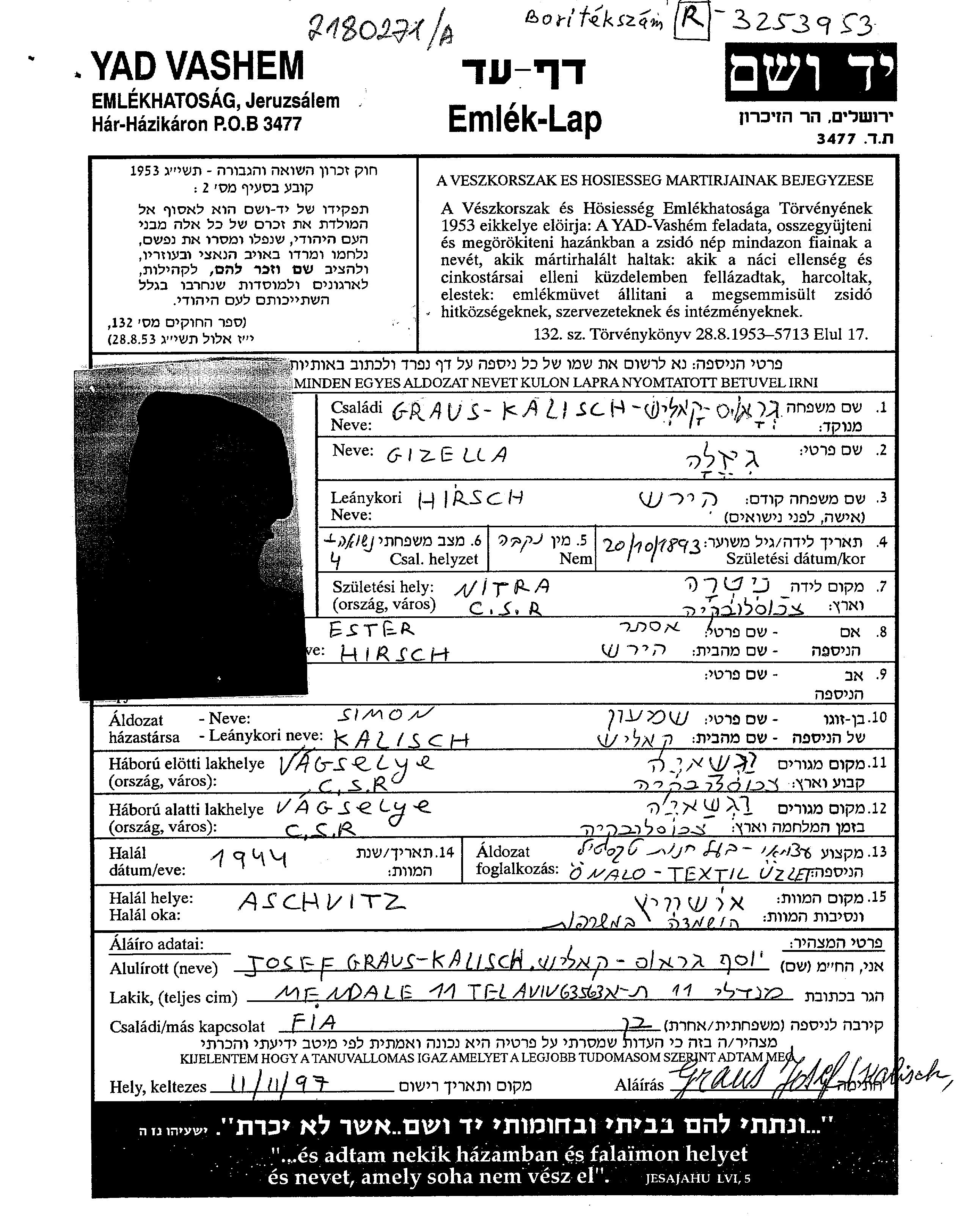 Гизела Генендл Калиш Граус, девичья фамилия Хирш, место рождения: Нитра, Чехословакия. Торговец / торговка. Место жительства до войны: Шаля, Чехословакия.