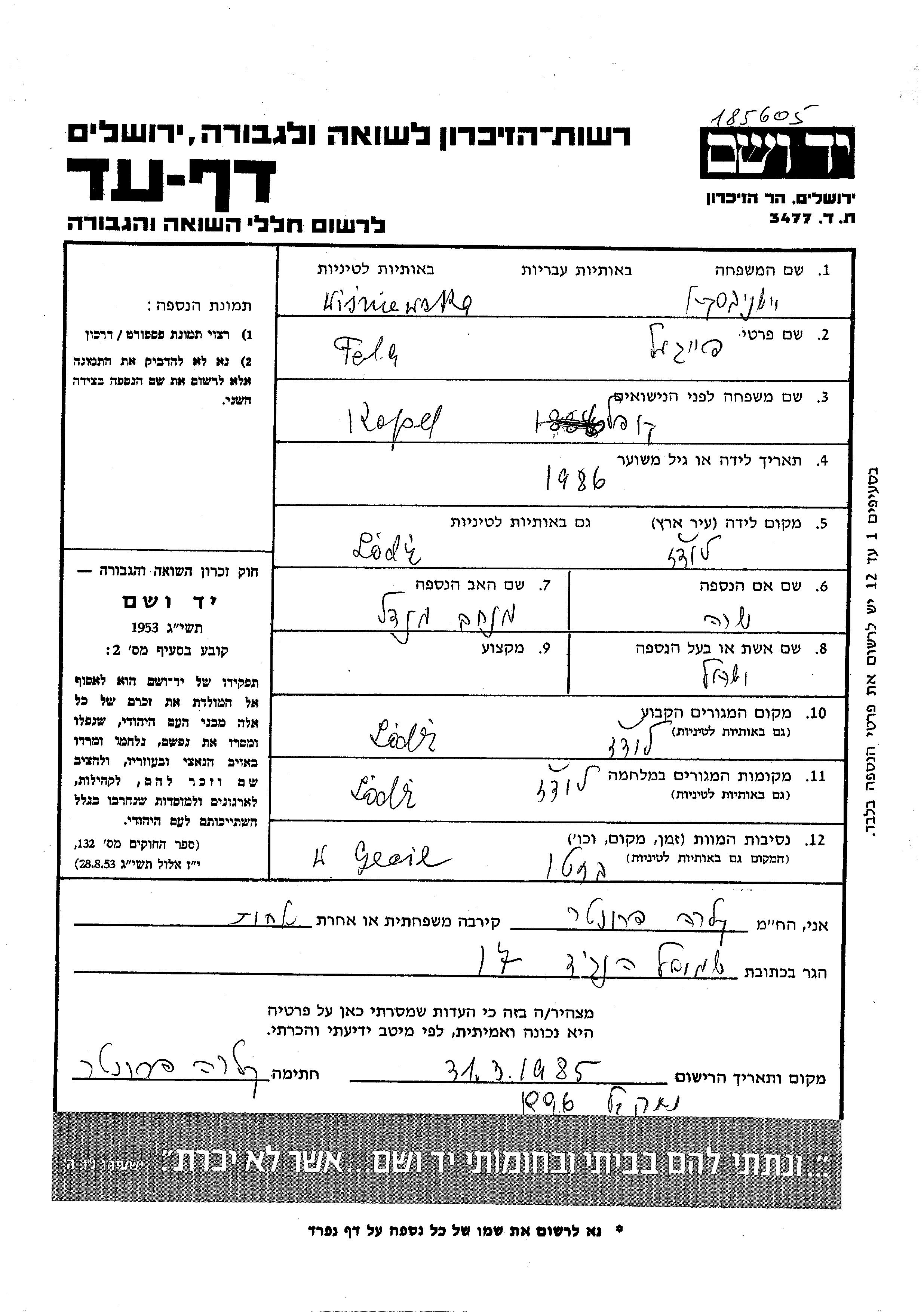 Висневски Файгель Лодзь, Польша Лист свидетельских показаний