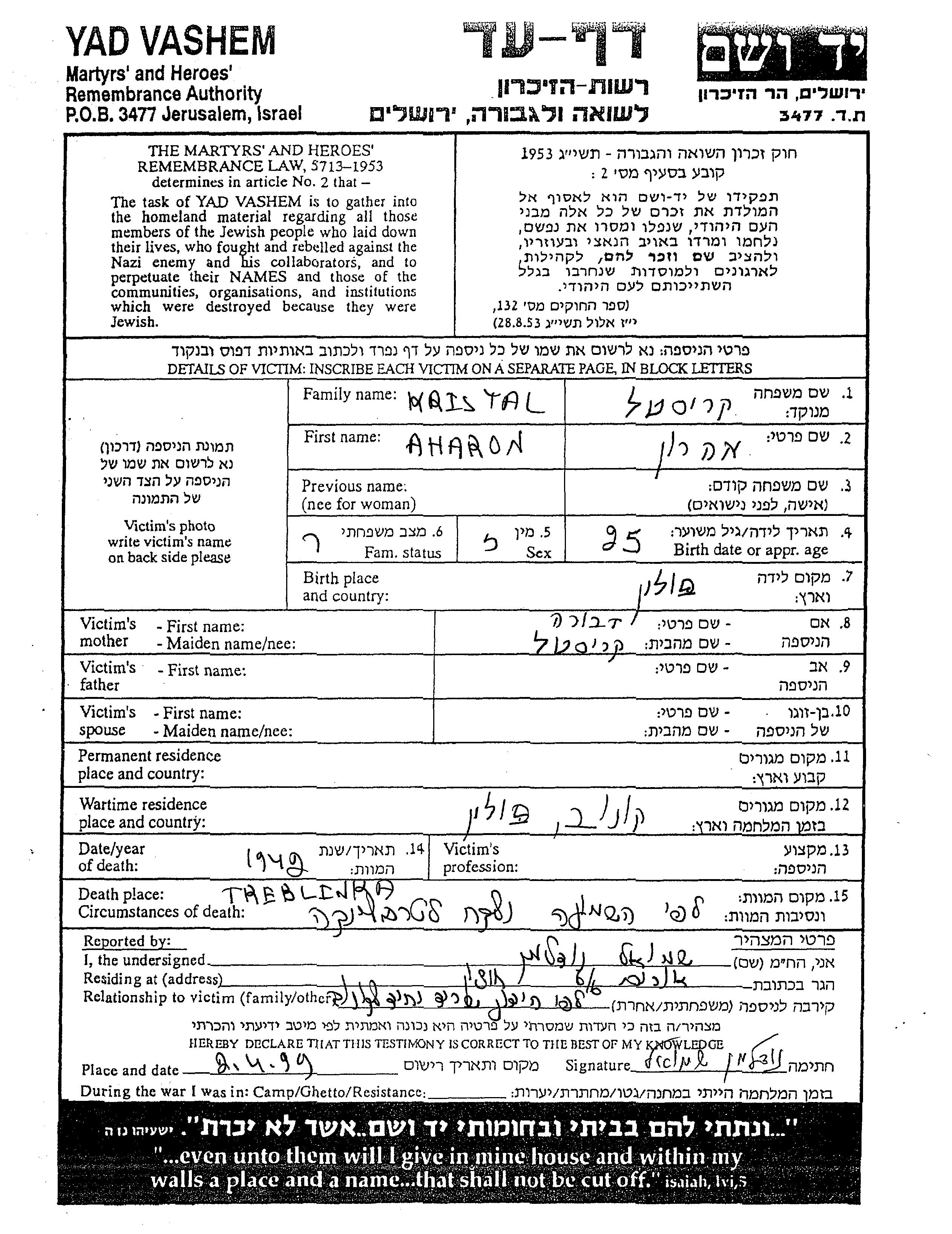 Арон Кристаль, место рождения: Польша.Mать:Двора. Холост / не замужем. Место во время войны: Кунув, Польша.