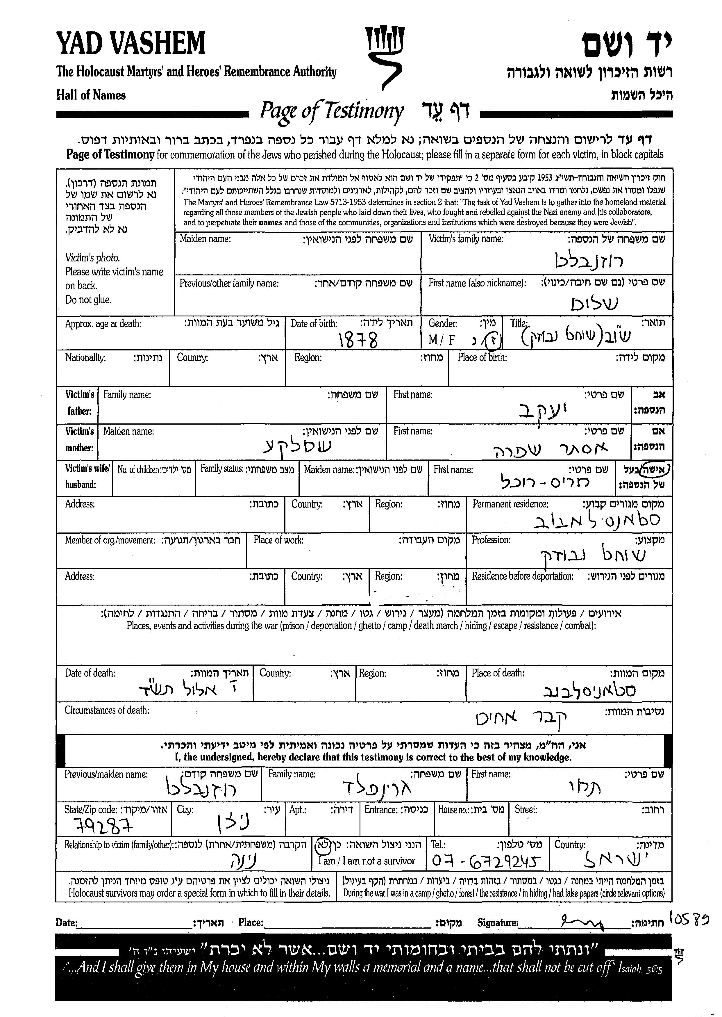 Розенблат | Шалом | 1878 | Станиславув, Польша | Лист свидетельских показаний |