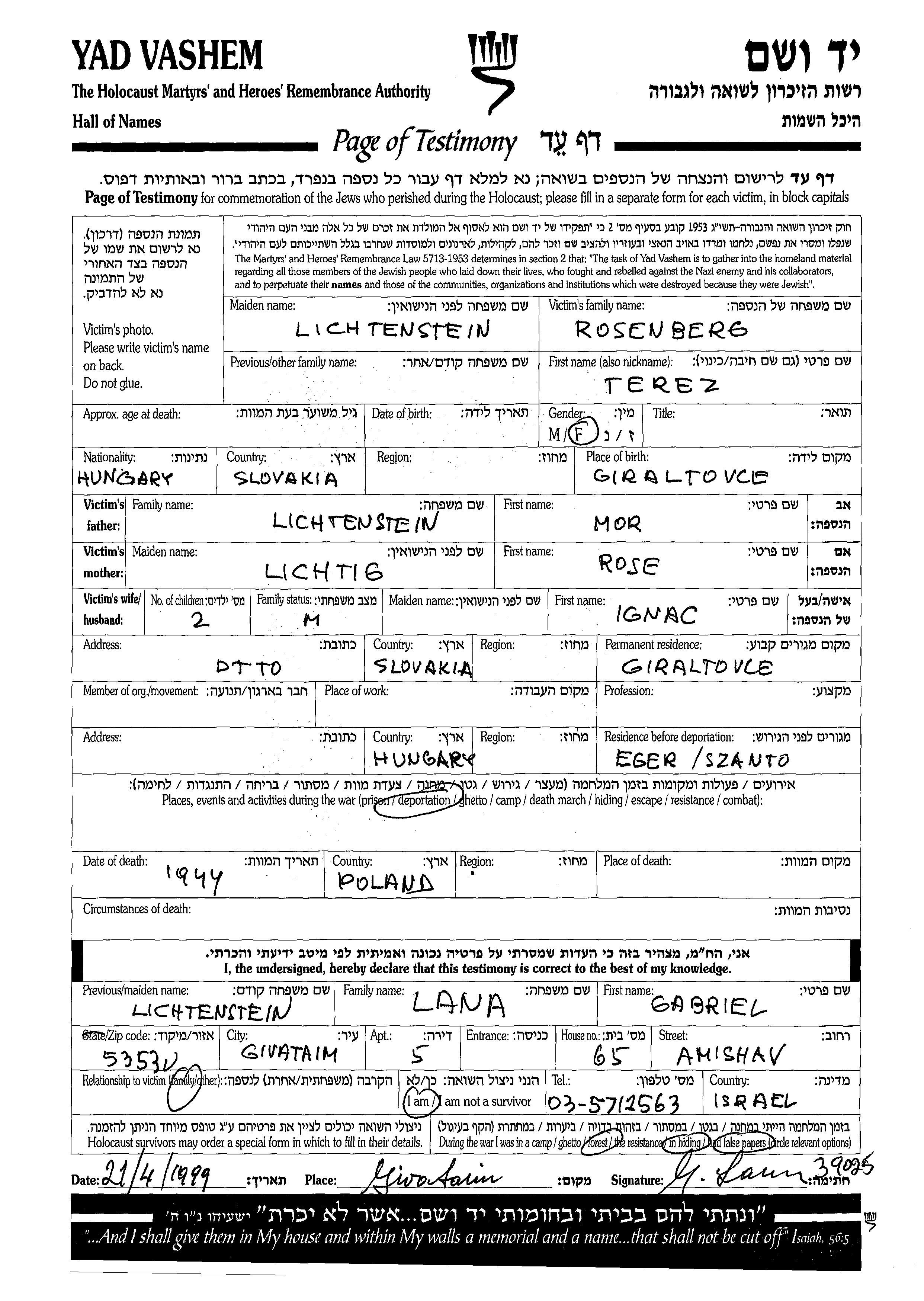 Терез Розенберг, девичья фамилия Лихтенштайн, место рождения: Гиральтовце, Чехословакия. Отец: Мор, mать:Роза. Женат / замужем. Место жительства до войны: Гиральтовце, Чехословакия. Место во время войны: Эгер, Венгрия.