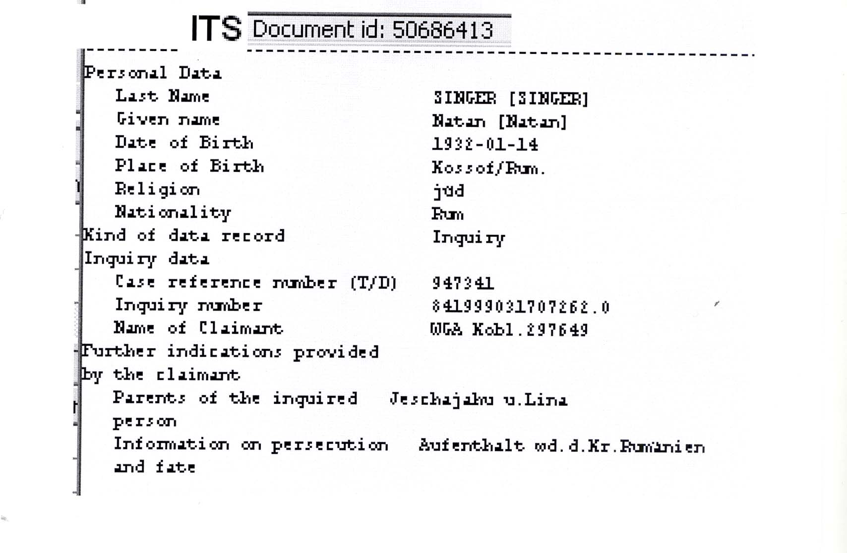 | Зингер | Натан | 1932 | Косов, Польша | Анкета для переживших Шоа, эвакуированных и беженцев |