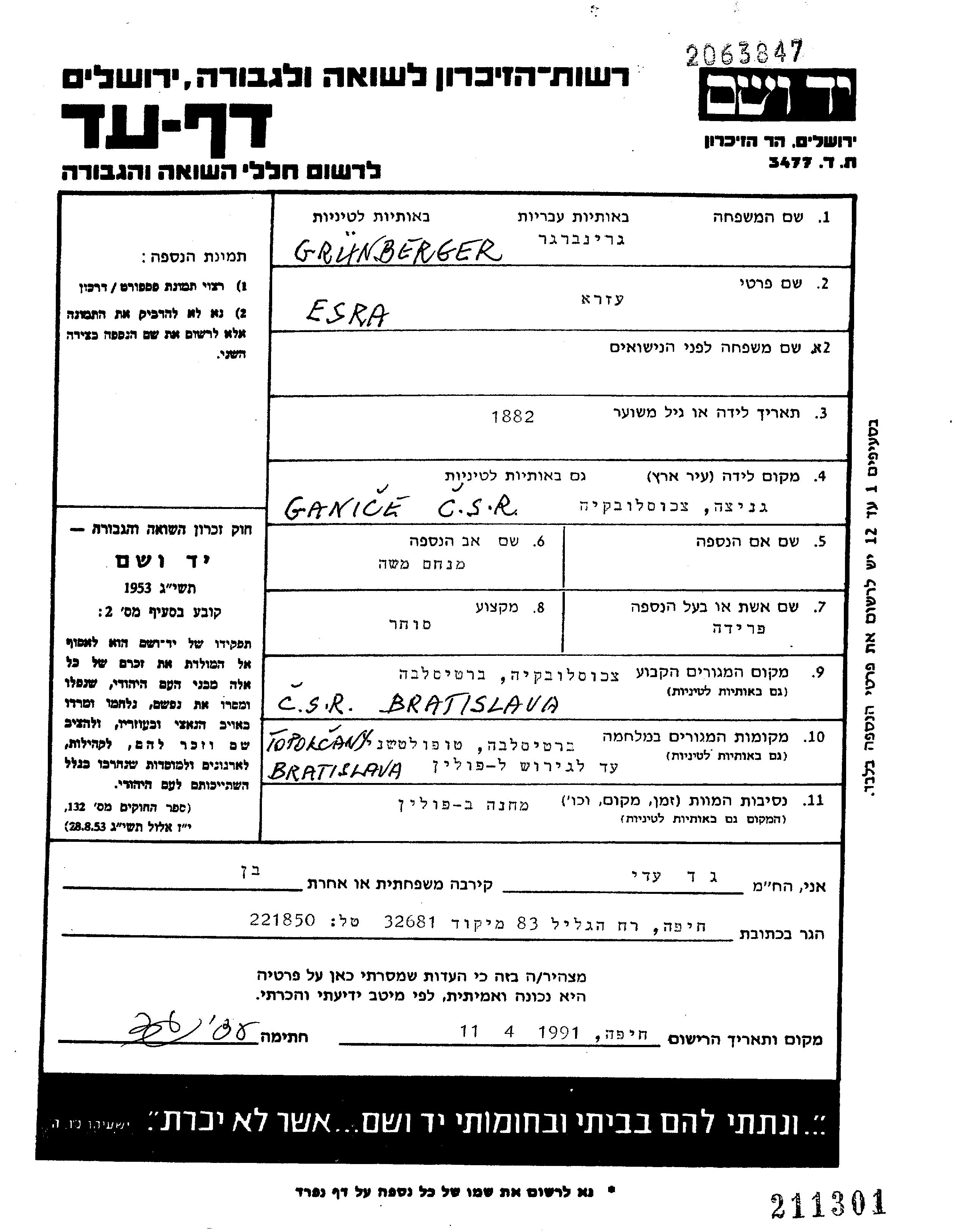 Гринбергер Эзра Братислава, Чехословакия Лист свидетельских показаний (электронный)