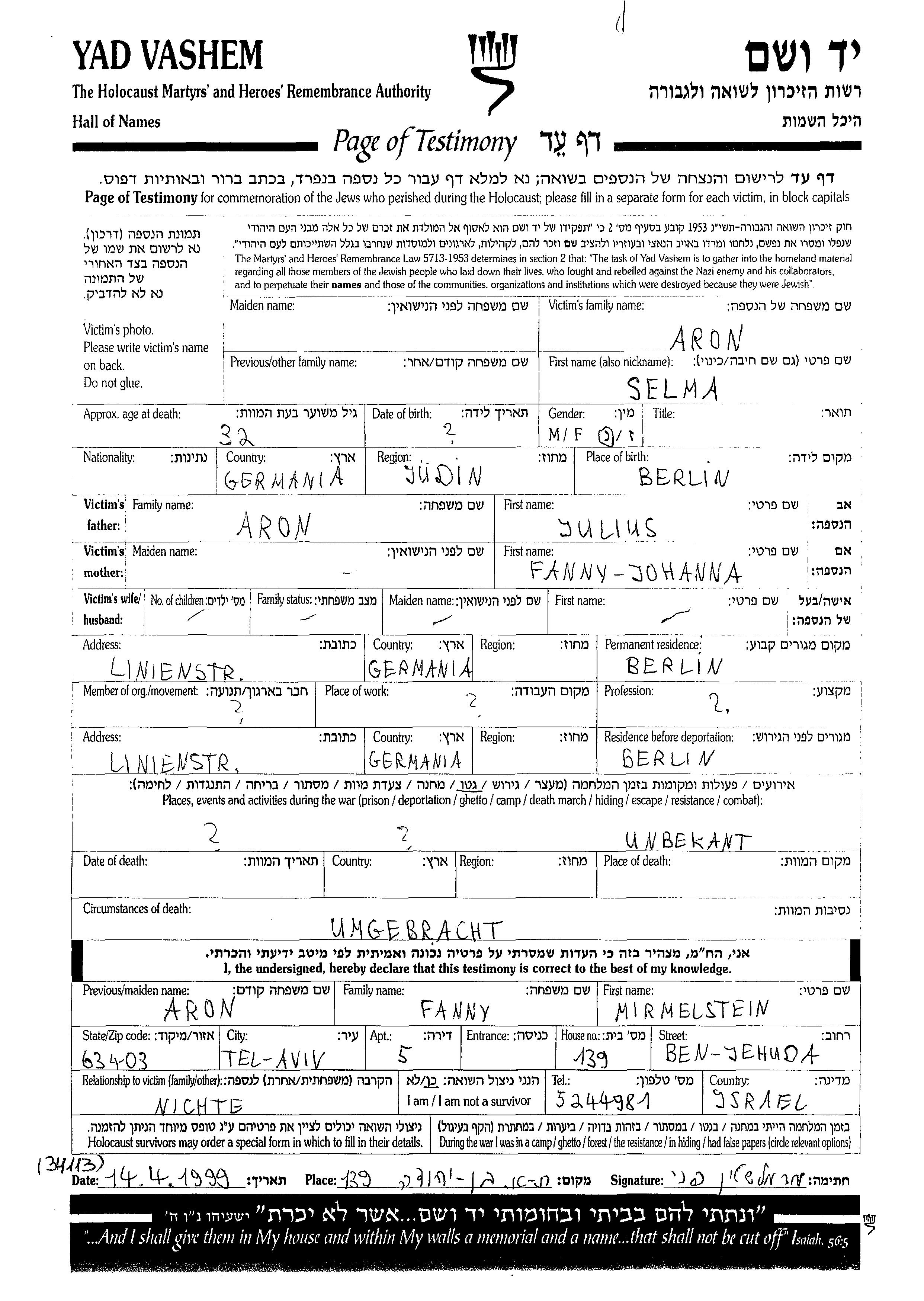 Арон Сельма Берлин, Германия Лист свидетельских показаний