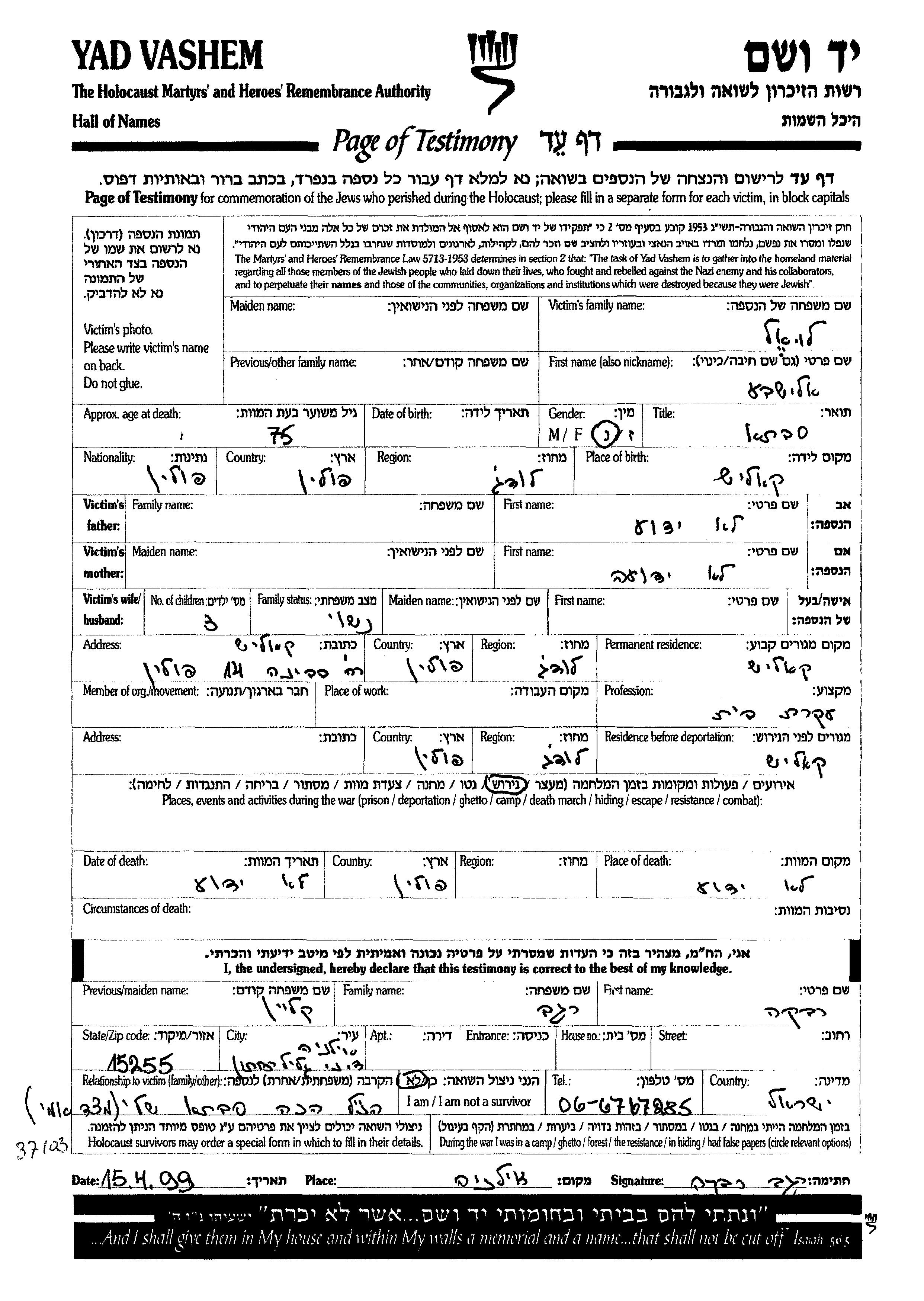 Луэль Элишева Калиш, Польша Лист свидетельских показаний