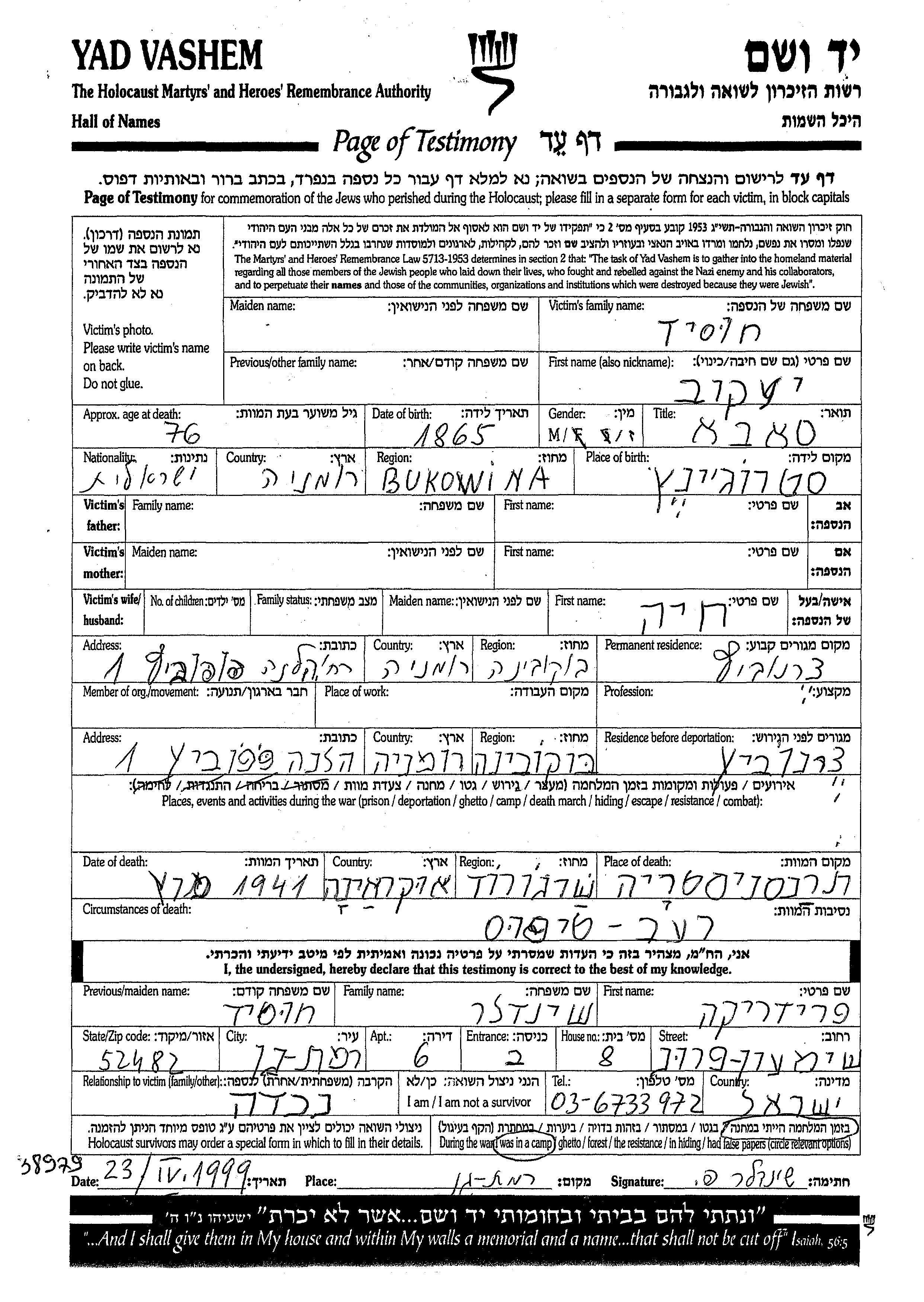 Яков Хусид, место рождения: Строжинец, Румыния. Место жительства до войны: Черновцы, Румыния. Место во время войны: Черновцы, Румыния.