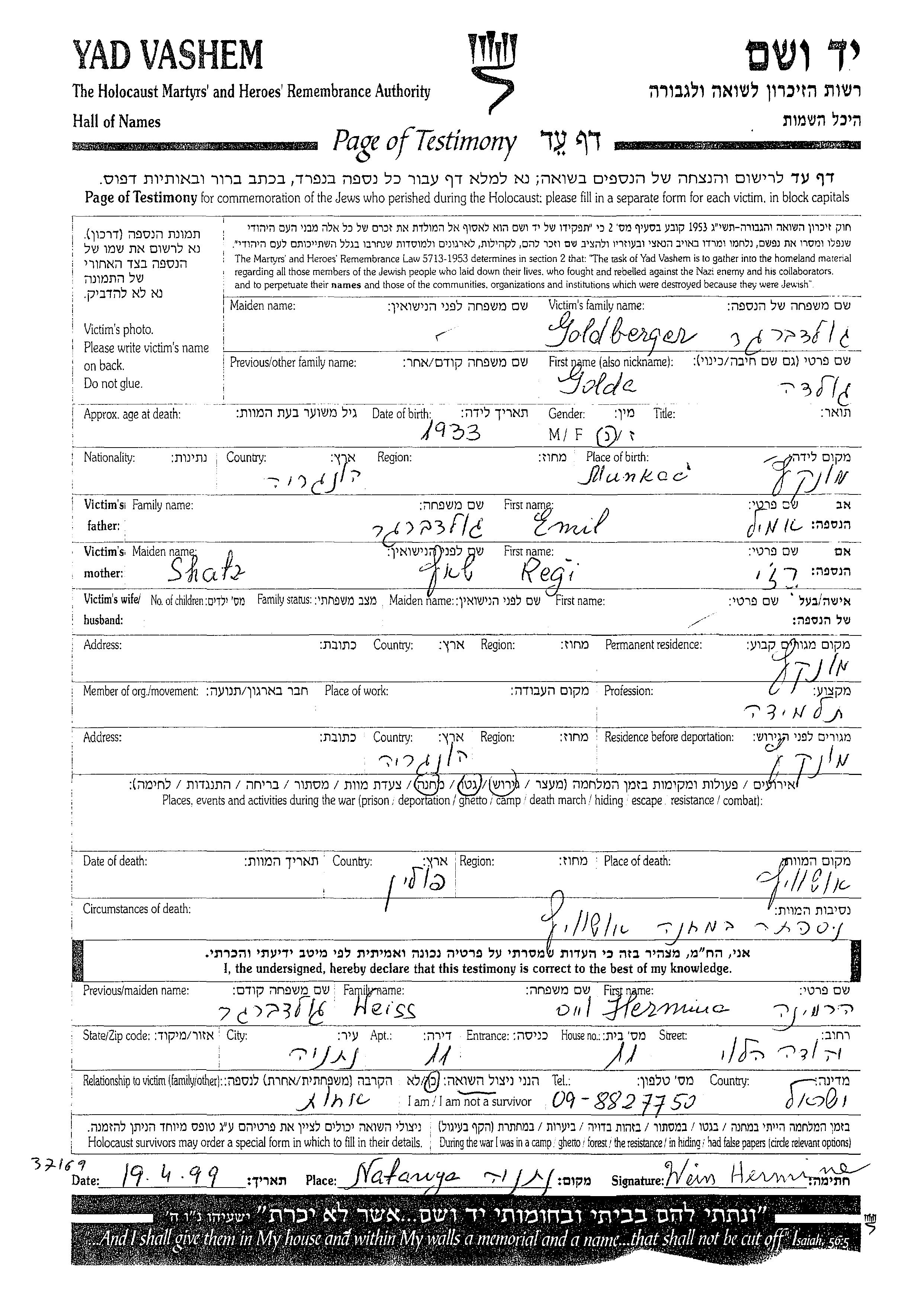 Гольдбергер Голда 1933 Мункач, Чехословакия Лист свидетельских показаний