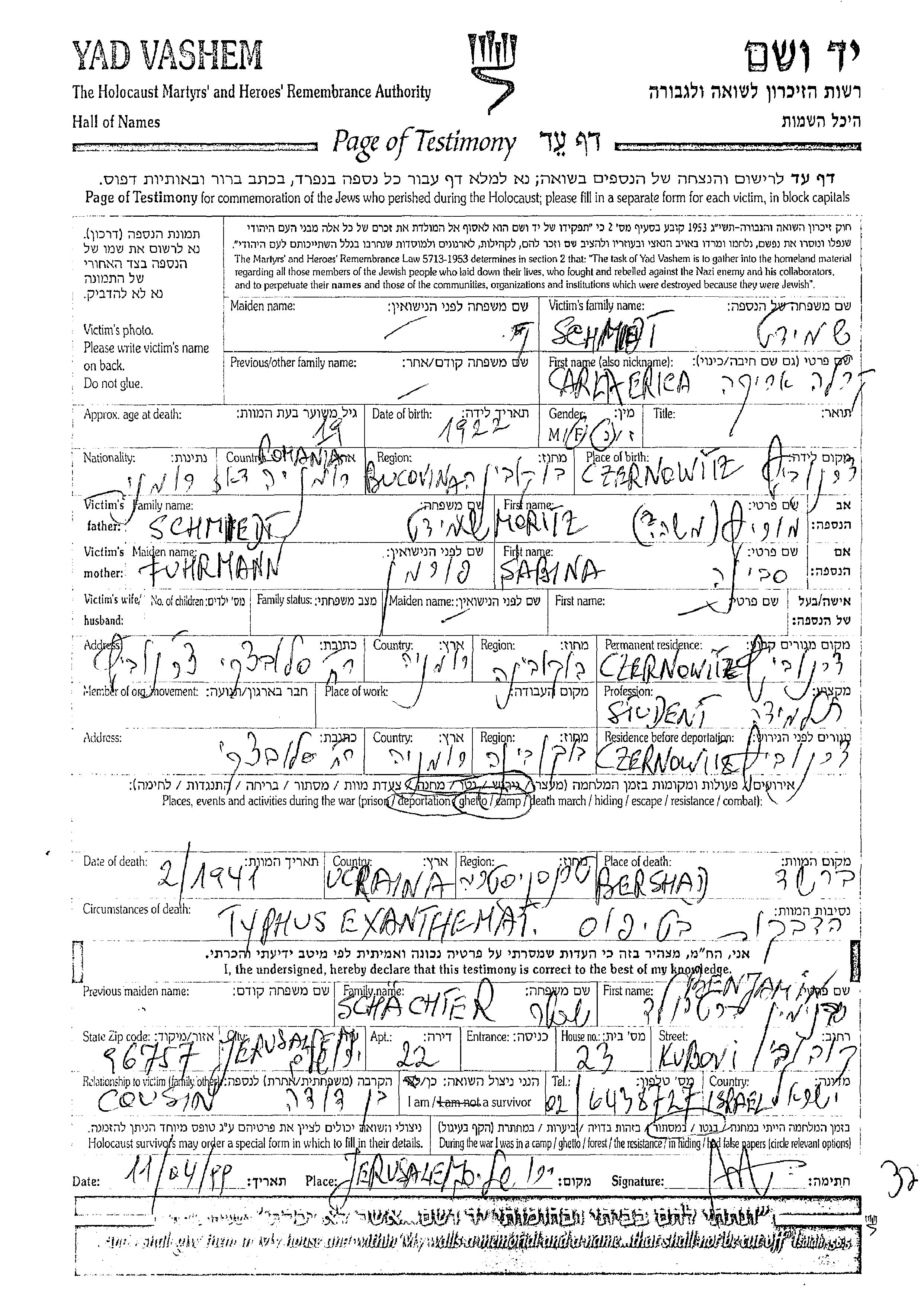 Карла Эрика Шмидт, место рождения: Черновцы, Румыния. Отец: Мориц Моше, mать:Сабина. Ученик / ученица. Место жительства до войны: Черновцы, Румыния. Место во время войны: Черновцы, Румыния.