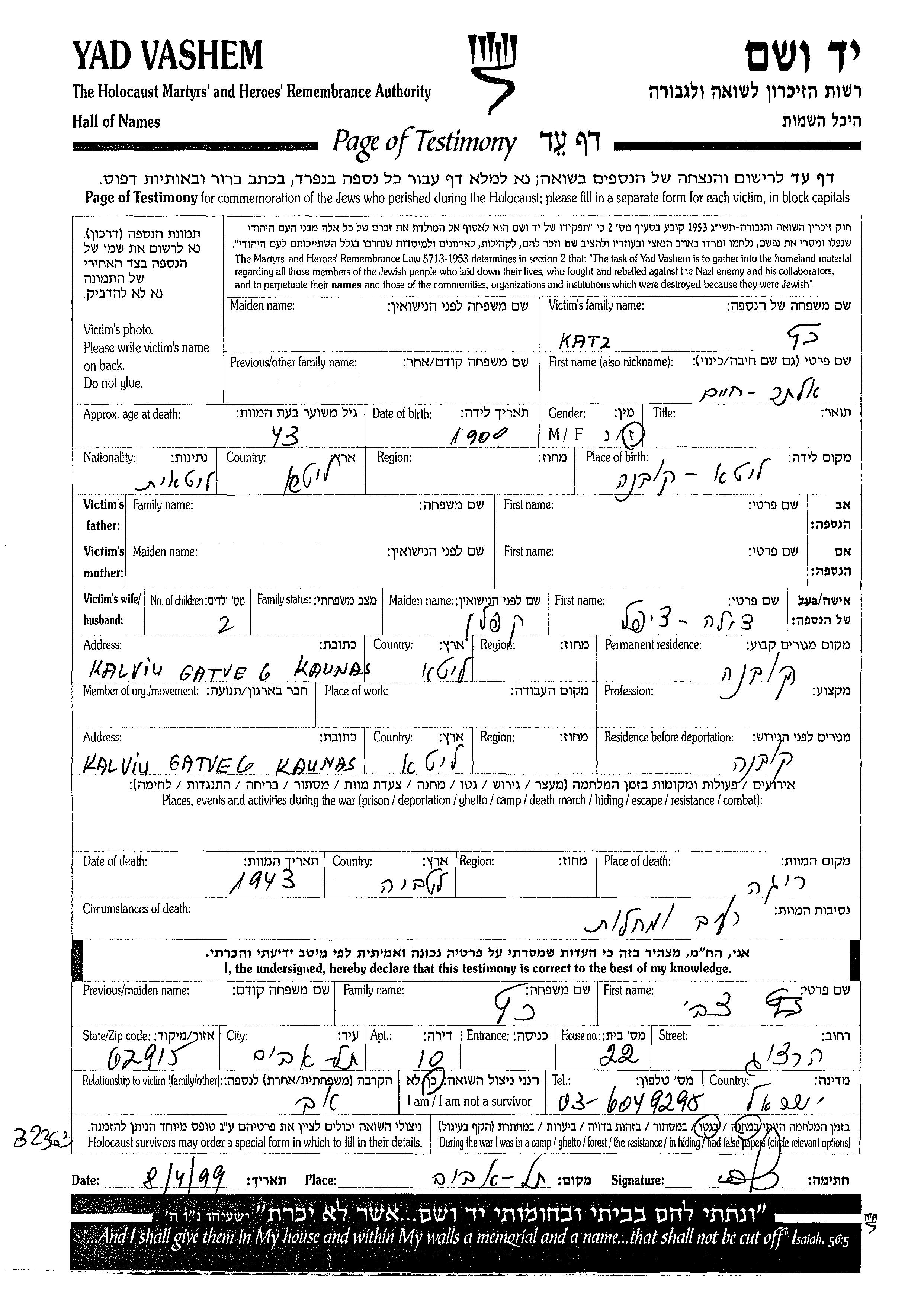 Кац Алтер Хаим 1900 Ковна, Литва Лист свидетельских показаний