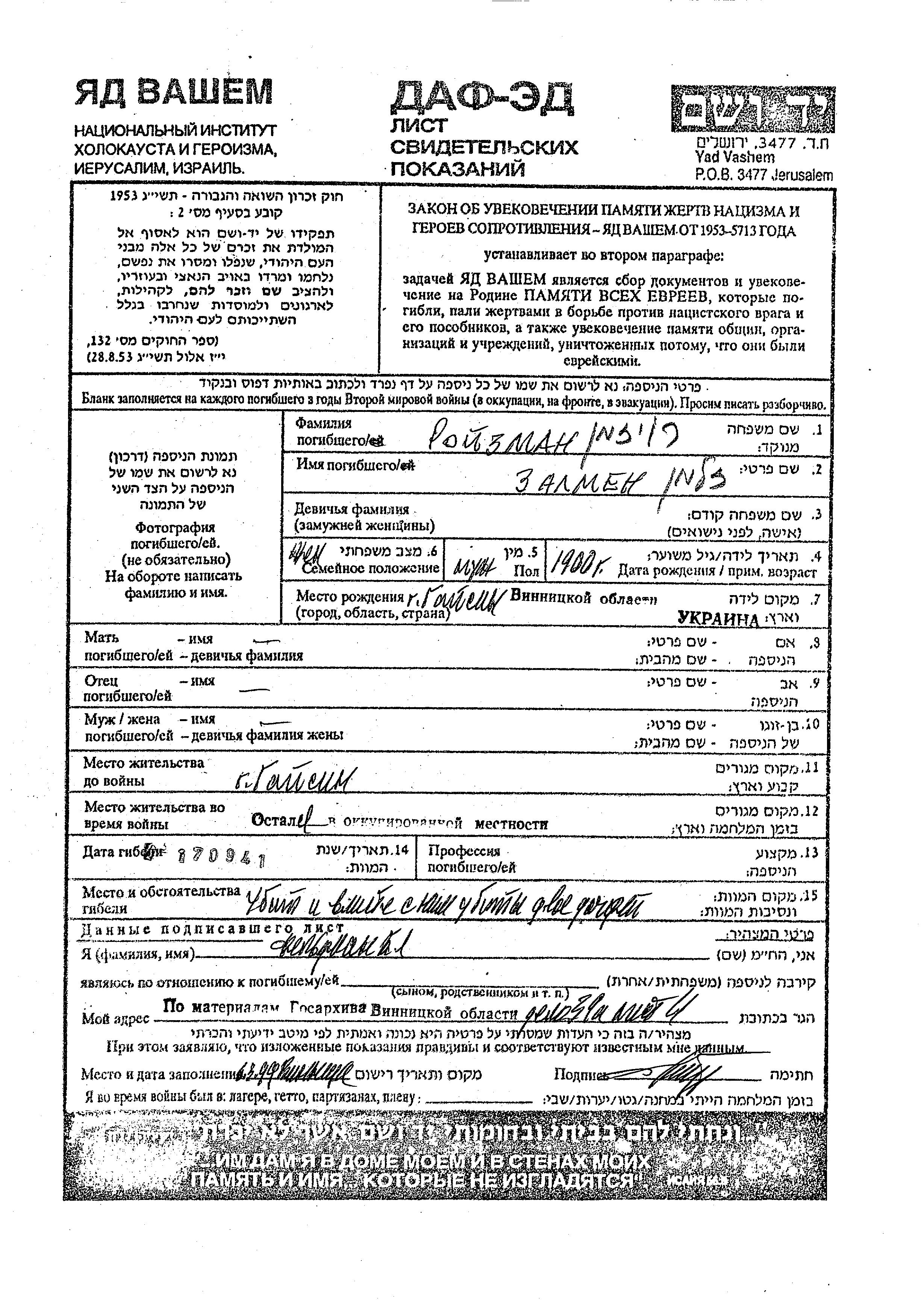 Яд Вашем - Листы свидетельских показаний Мемориального фонда
