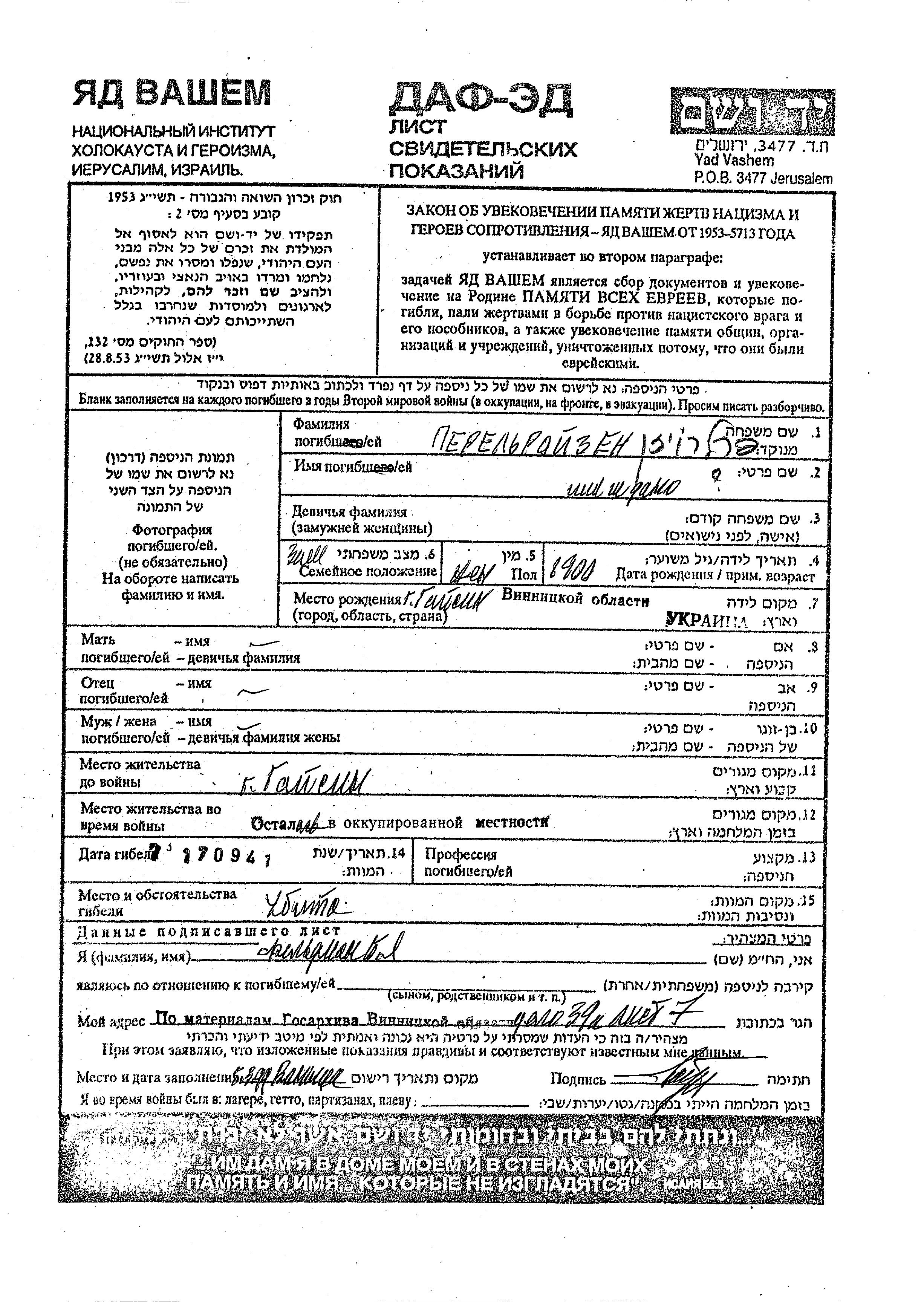 Перельройзен Имя неизвестно 1900 Гайсин, Украина (СССР) Лист свидетельских показаний