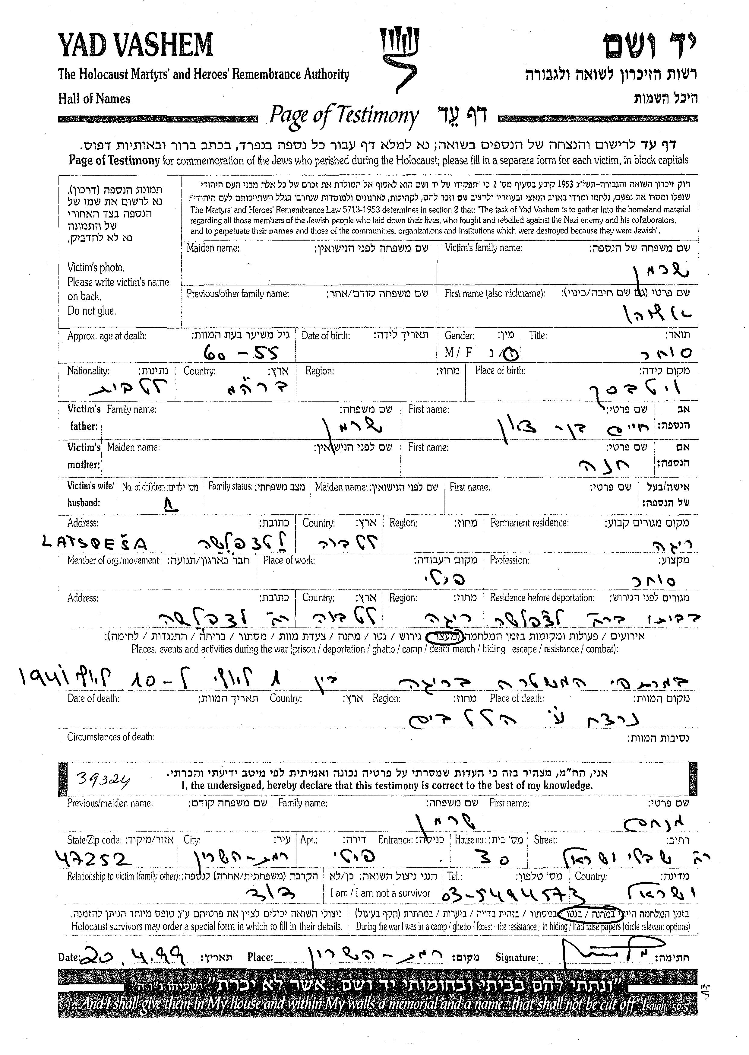 Яд Вашем - Листы свидетельских показаний Мемориального фонда