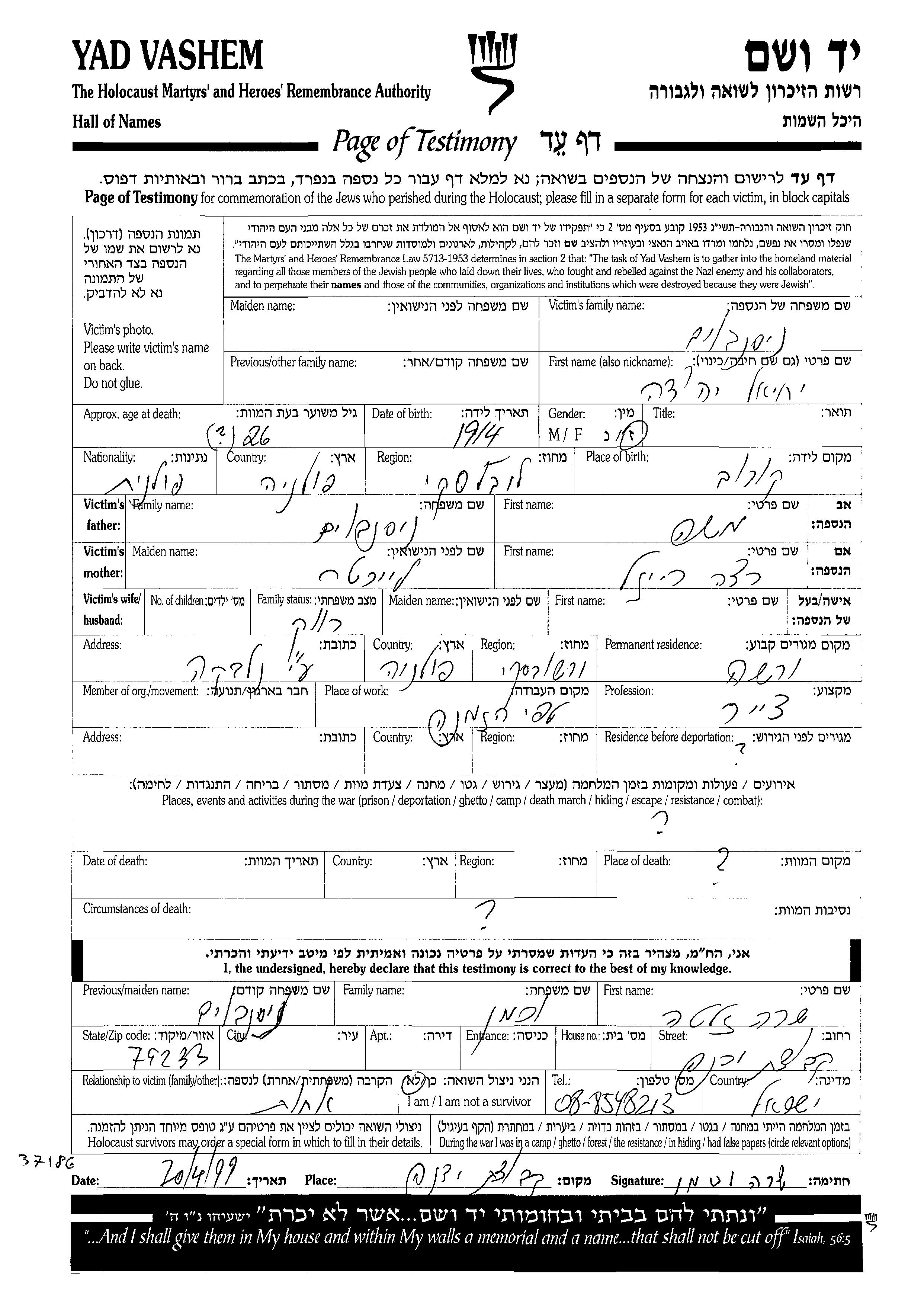 Яд Вашем - Листы свидетельских показаний Мемориального фонда