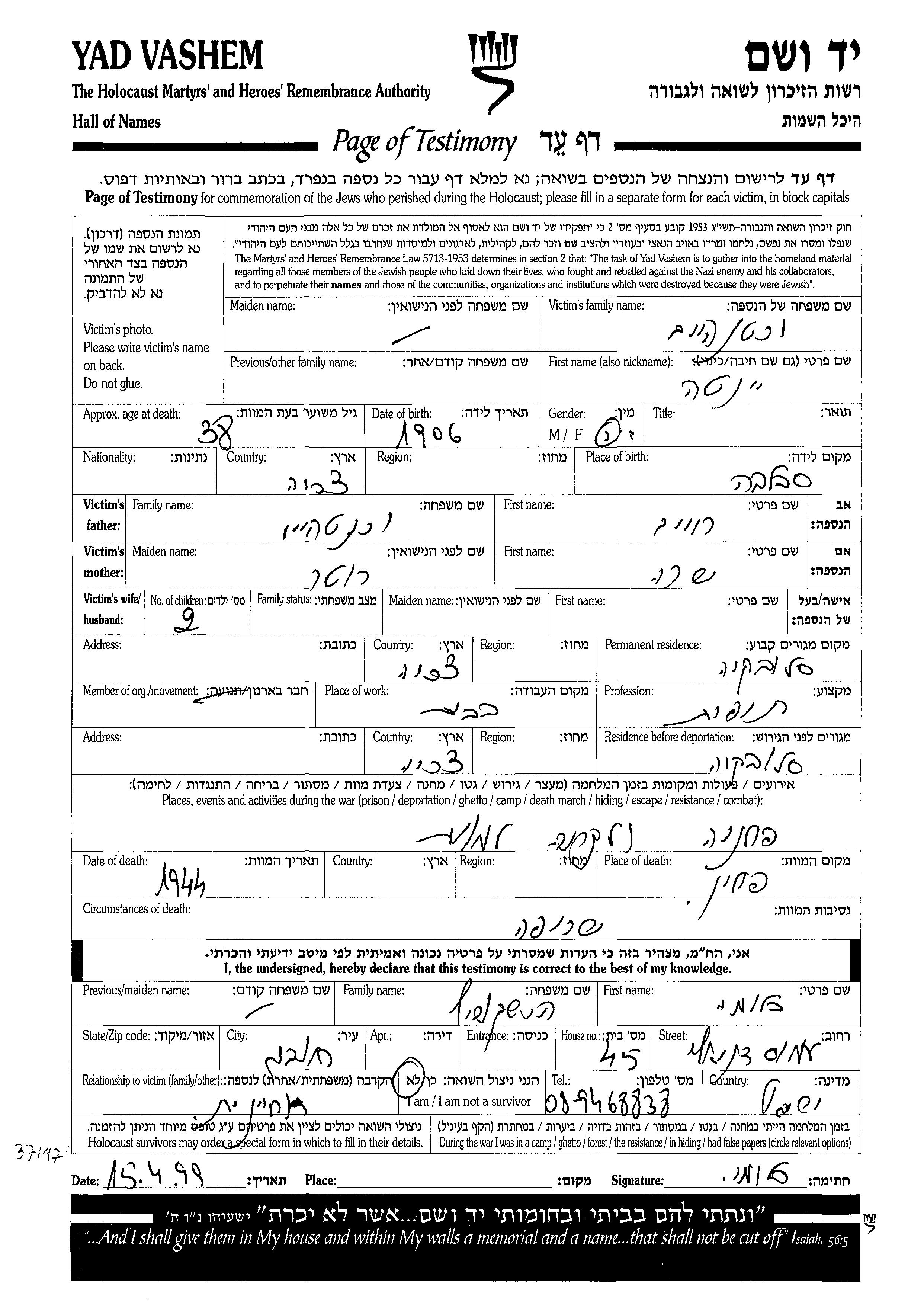 Яд Вашем - Листы свидетельских показаний Мемориального фонда