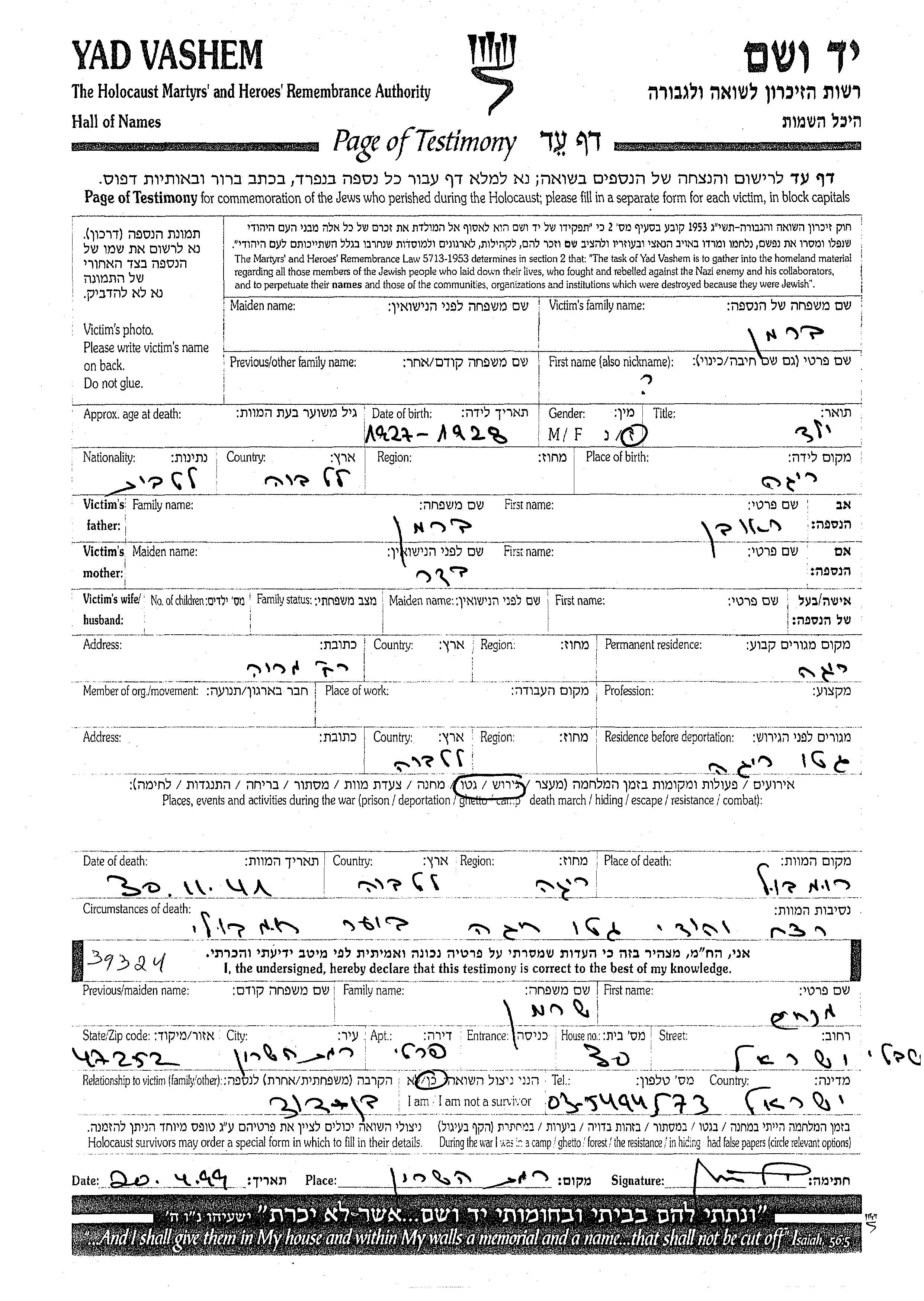 Яд Вашем - Листы свидетельских показаний Мемориального фонда