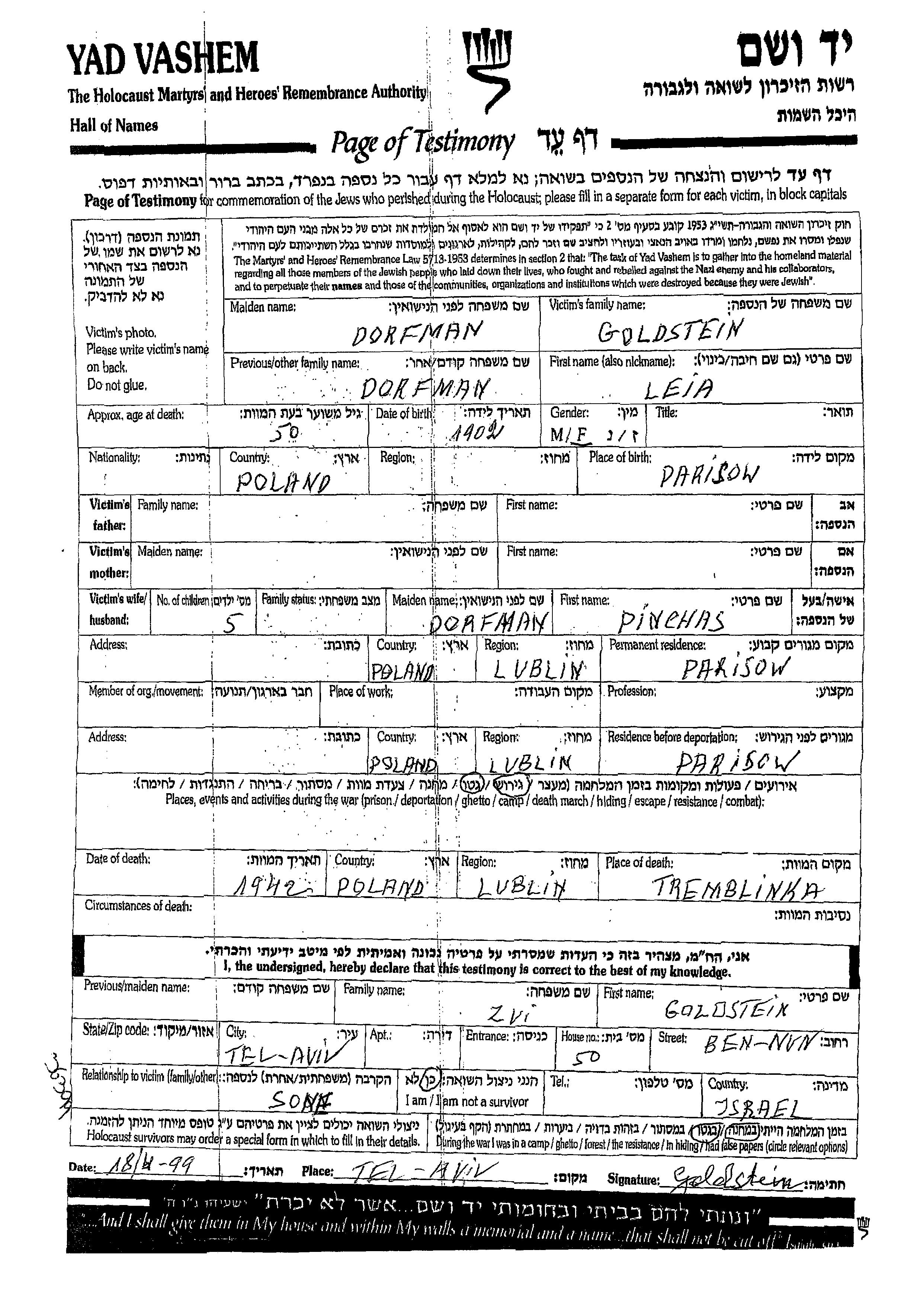 Лея Гольдштейн, девичья фамилия Дорфман, место рождения: Парисов, Польша. Место жительства до войны: Парисов, Польша. Место во время войны: Парисов, Польша.