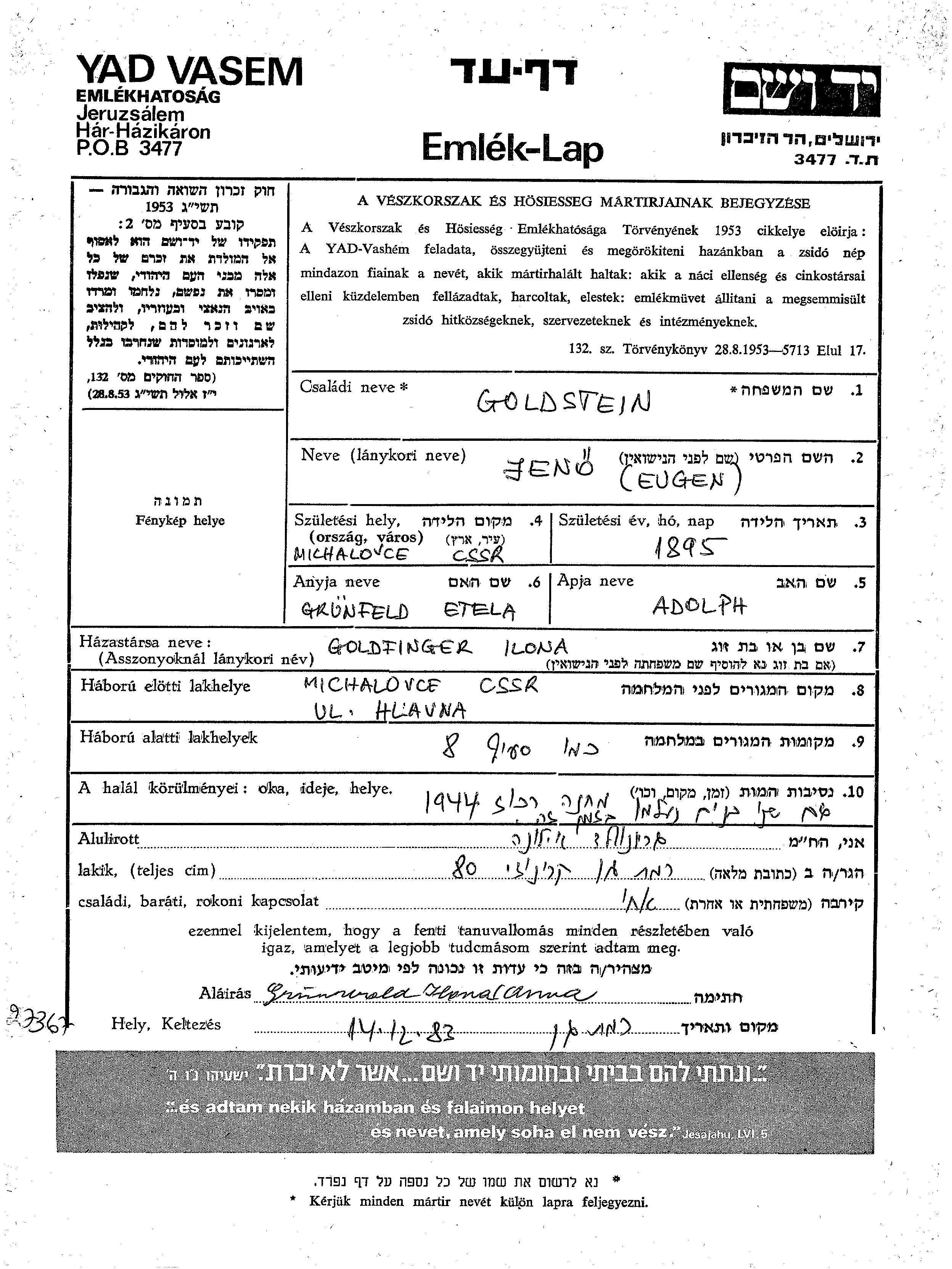 Ено Эуген Гольдштейн, место рождения: Михаловце, Чехословакия. Отец: Адольф, mать:Этела. Женат / замужем. Место жительства до войны: Михаловце, Чехословакия. Место во время войны: Михаловце, Чехословакия.
