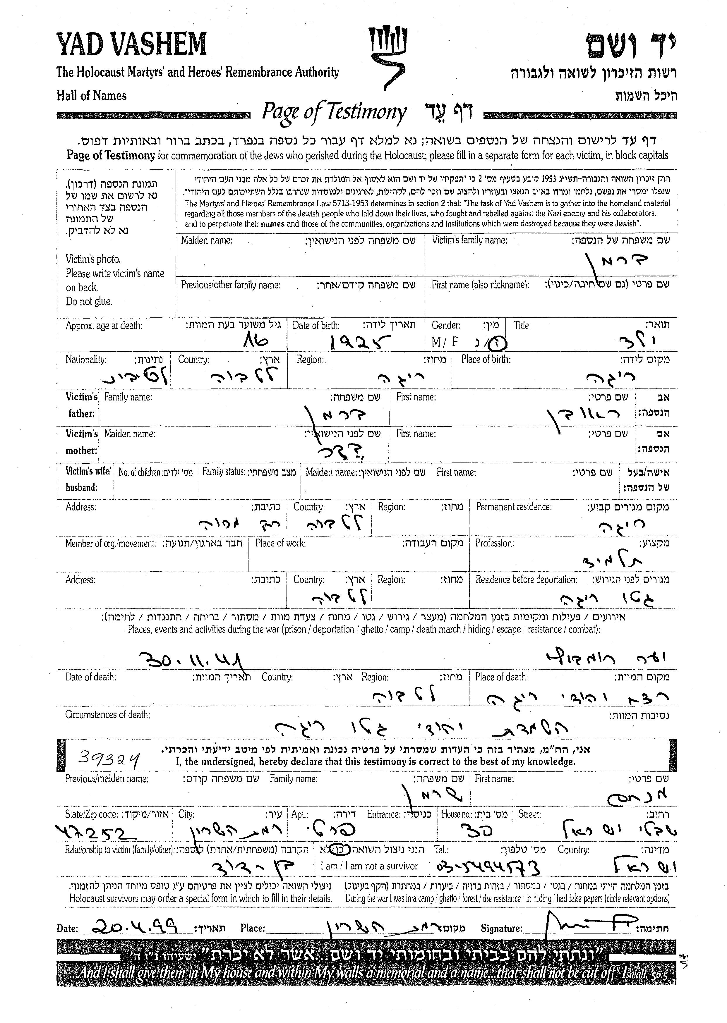 Яд Вашем - Листы свидетельских показаний Мемориального фонда