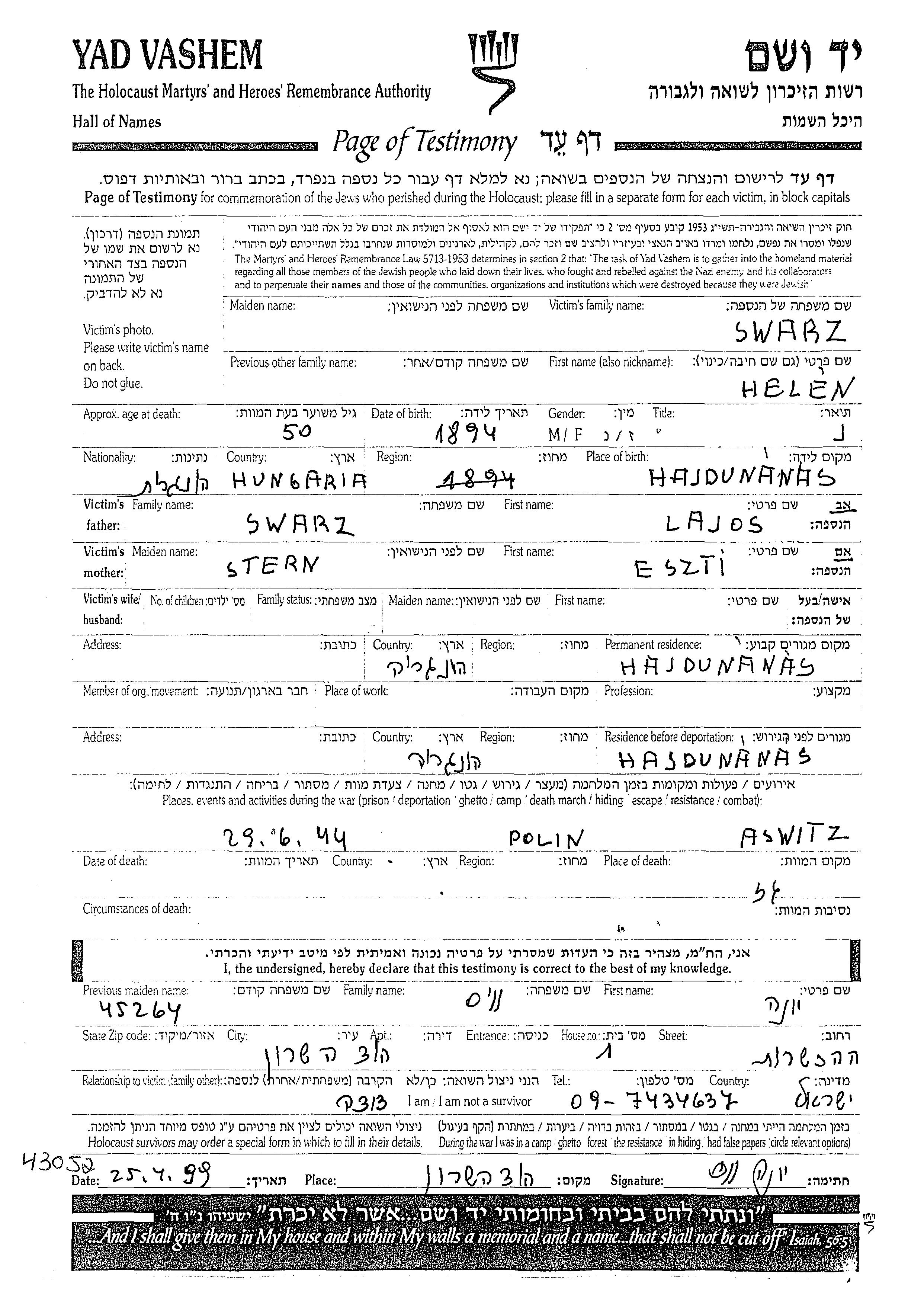 Хелен Шварц, место рождения: Хайдунанаш, Венгрия. Отец: Лайош, mать:Эсти. Место жительства до войны: Хайдунанаш, Венгрия. Место во время войны: Хайдунанаш, Венгрия.
