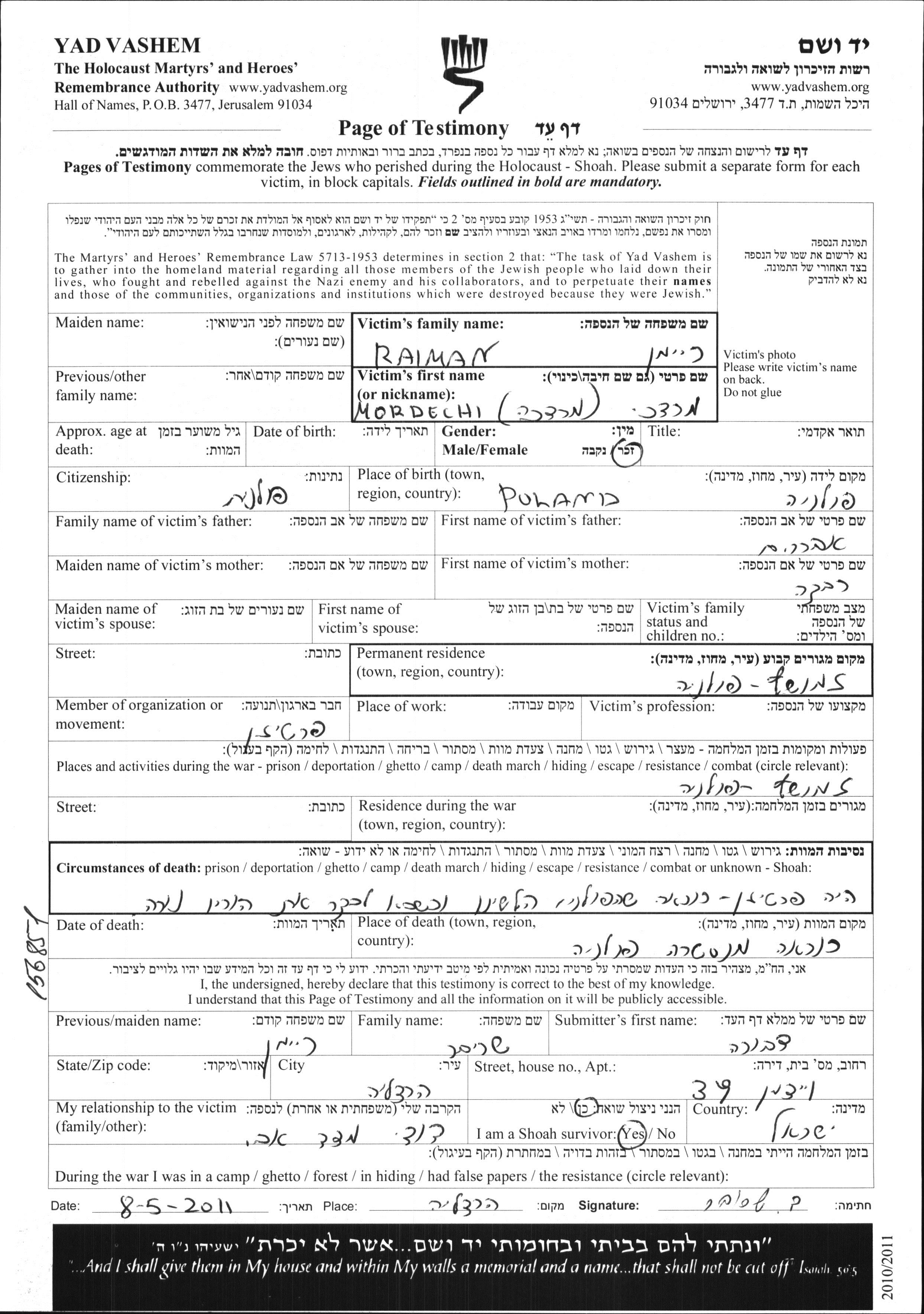 Мордехай Райман, место рождения: Польша. Отец: Авраам, mать:Ривка. Место жительства до войны: Замосць, Польша. Место во время войны: Замосць, Польша.