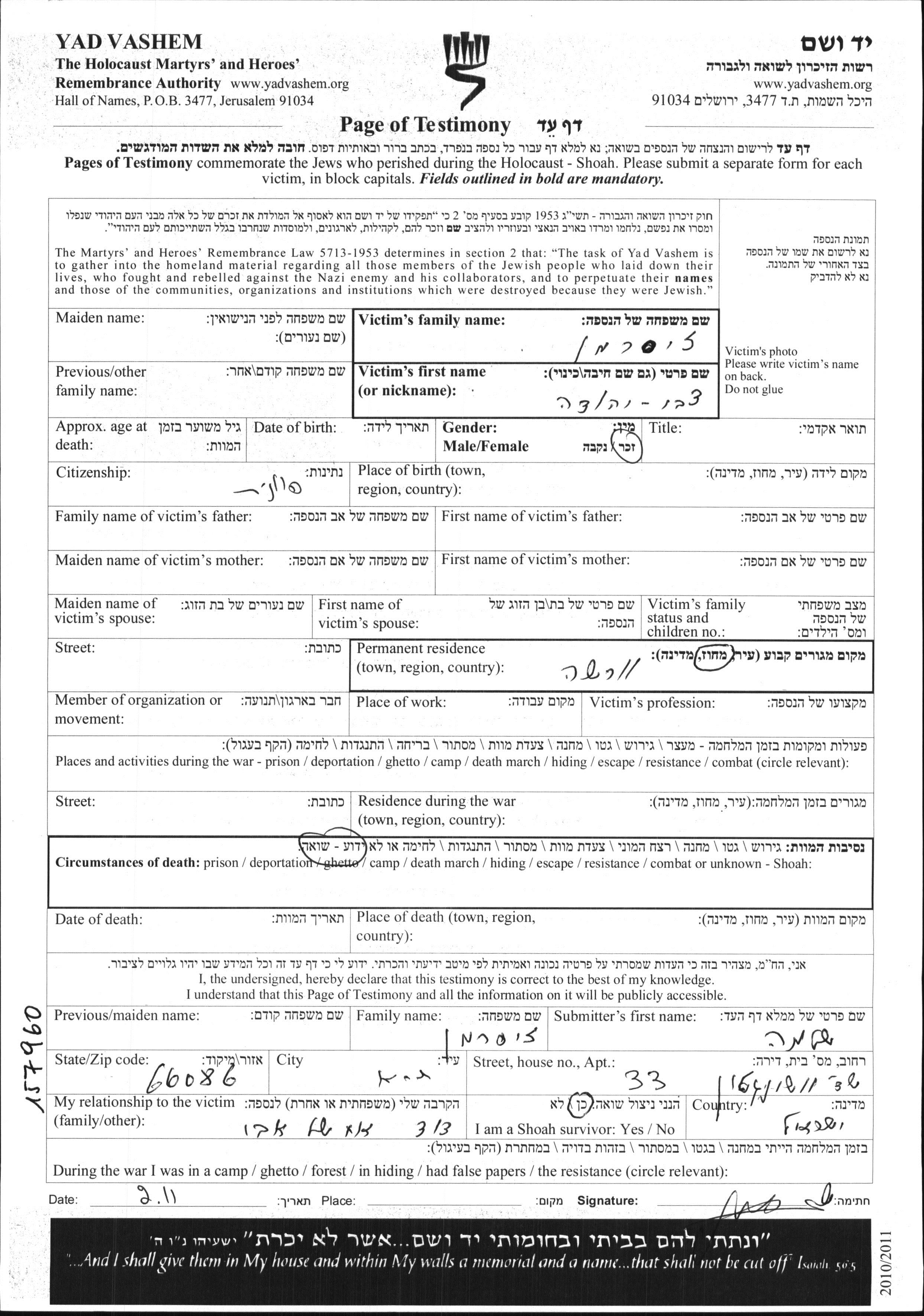 Зисерман Цви Иегуда Варшава, Польша Лист свидетельских показаний