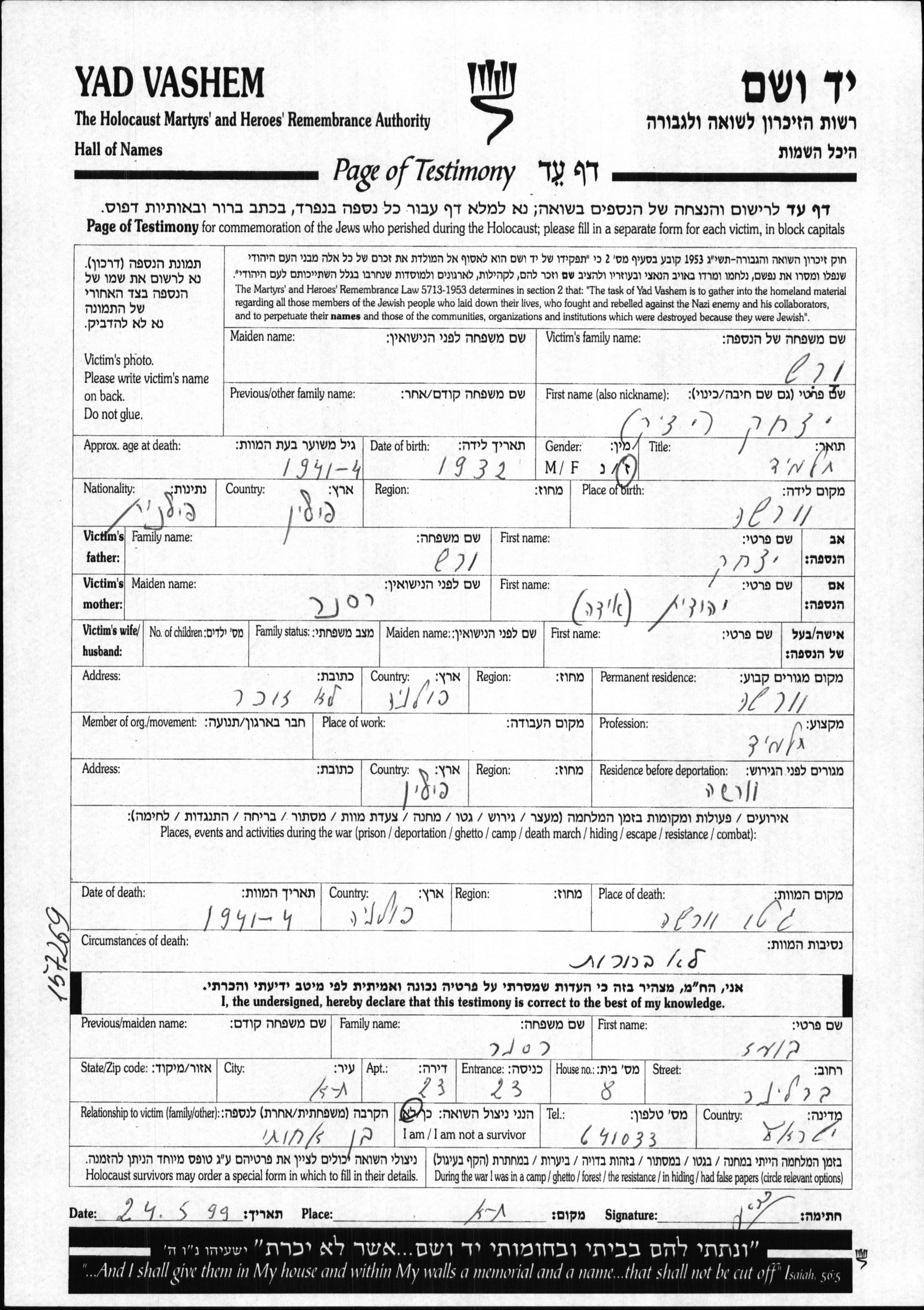 Яд Вашем - Листы свидетельских показаний Мемориального фонда