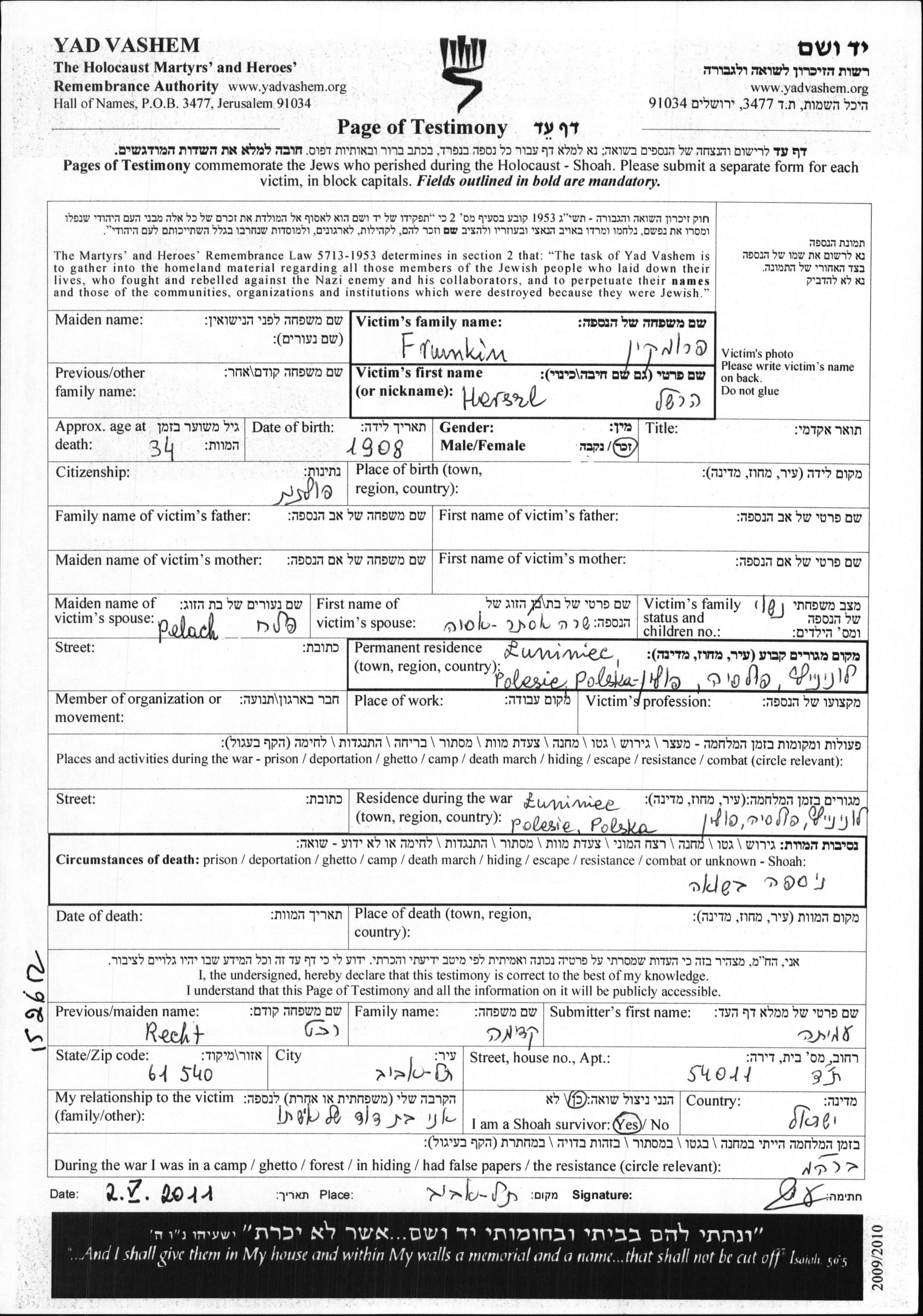 Хершл Фрумкин. Женат / замужем. Место жительства до войны: Лунинец, Польша. Место во время войны: Лунинец, Польша.