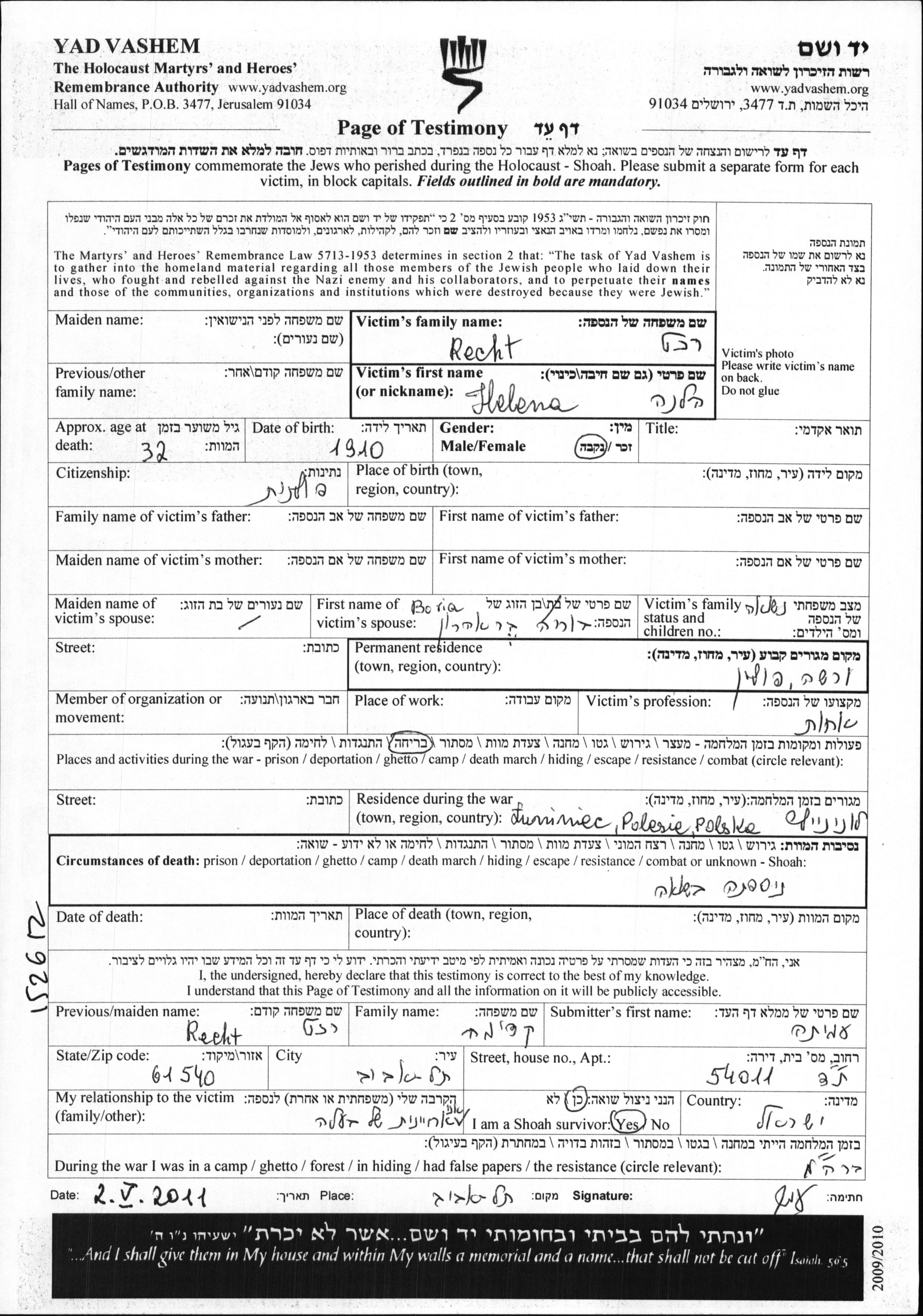 Хелена Рехт. Женат / замужем. Место жительства до войны: Варшава, Польша. Место во время войны: Лунинец, Польша.