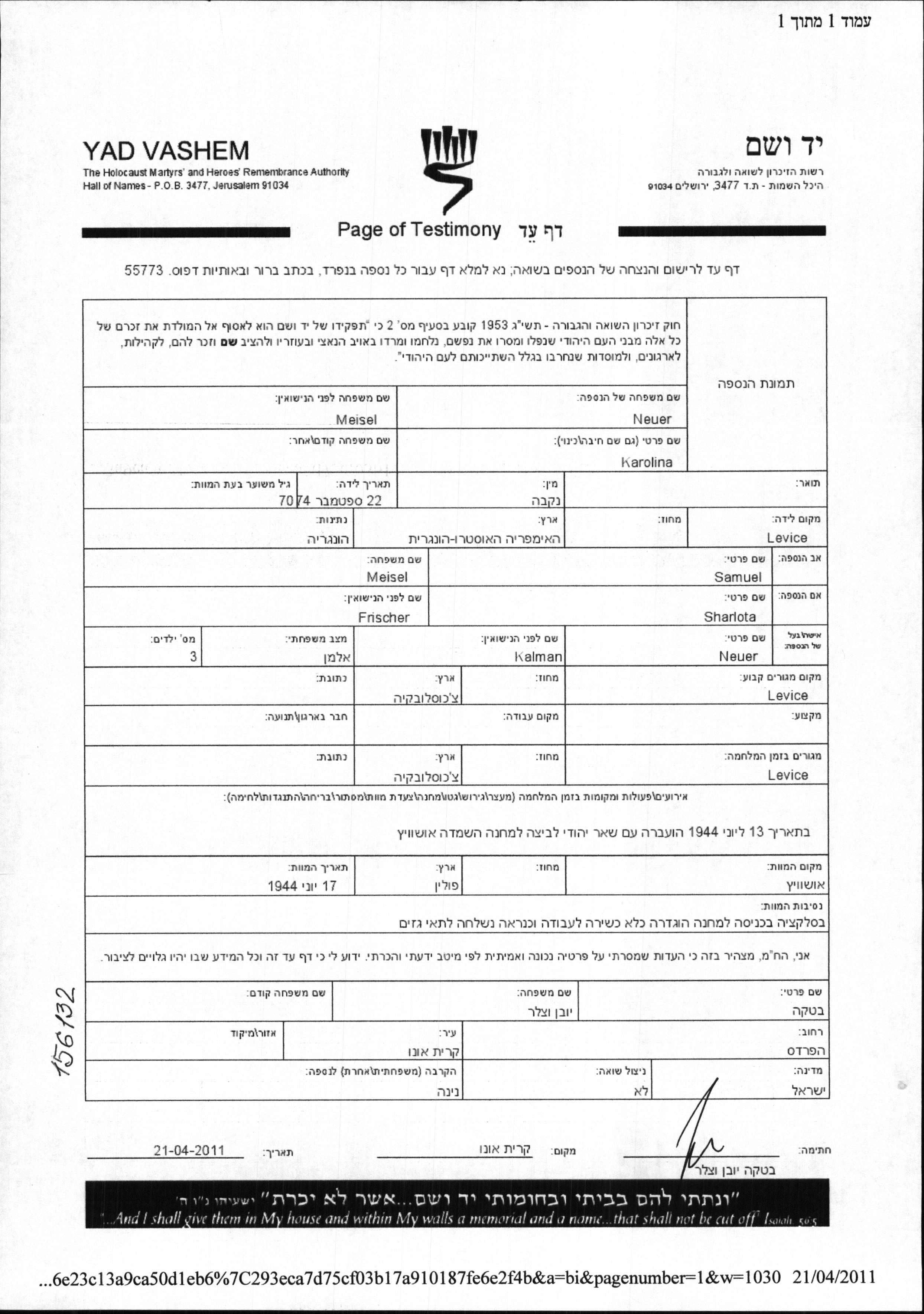 Каролина Нойер, девичья фамилия Мейзель, место рождения: Левице, Чехословакия. Отец: Самуэль, mать:Шарлота, девичья фамилия Фришер. Вдовец. Место жительства до войны: Левице, Чехословакия. Место во время войны: Левице, Чехословакия. Каролина уничтоженa в период Шоа. место смерти: Аушвиц, Польша в 17/06/1944.
