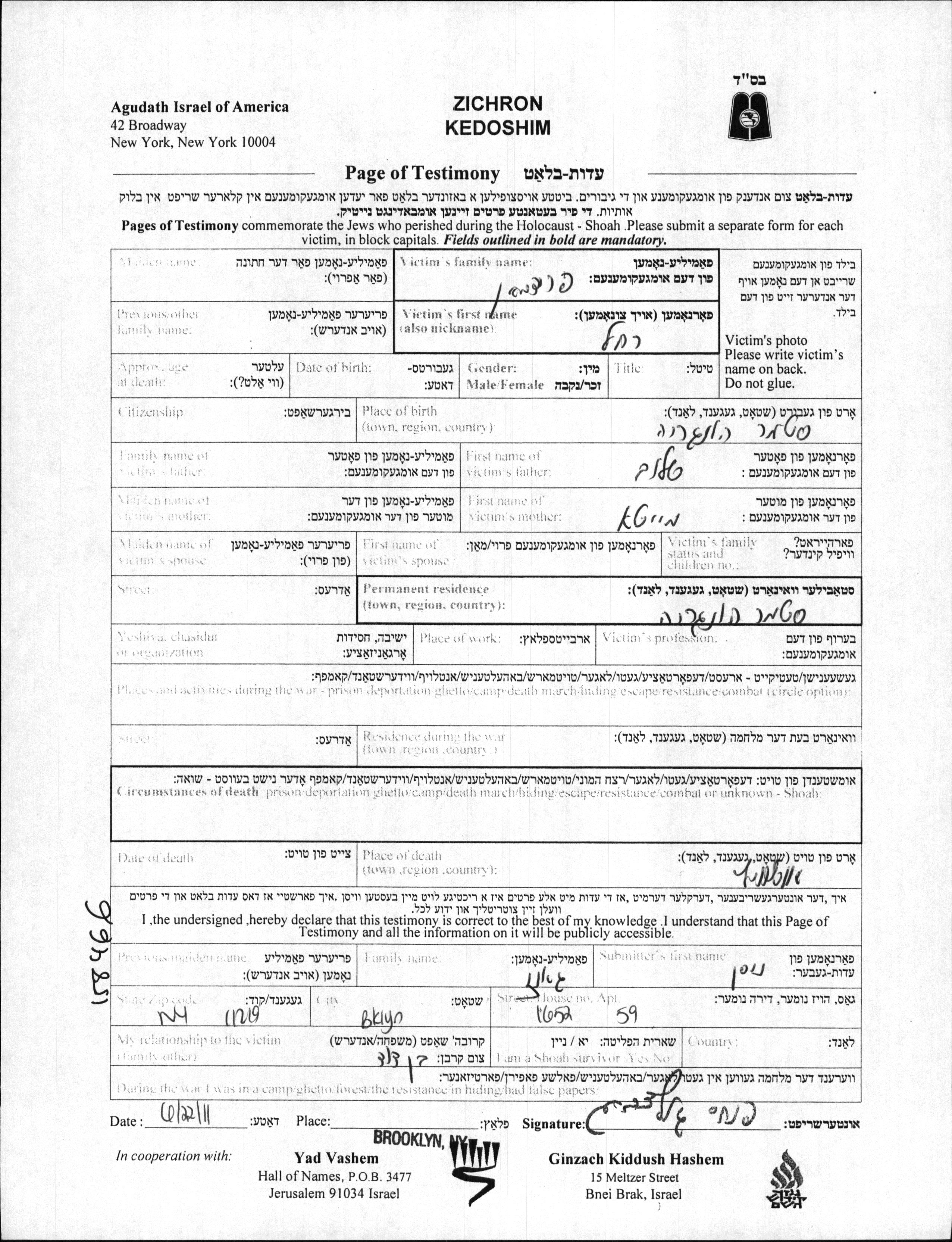 Яд Вашем - Листы свидетельских показаний Мемориального фонда