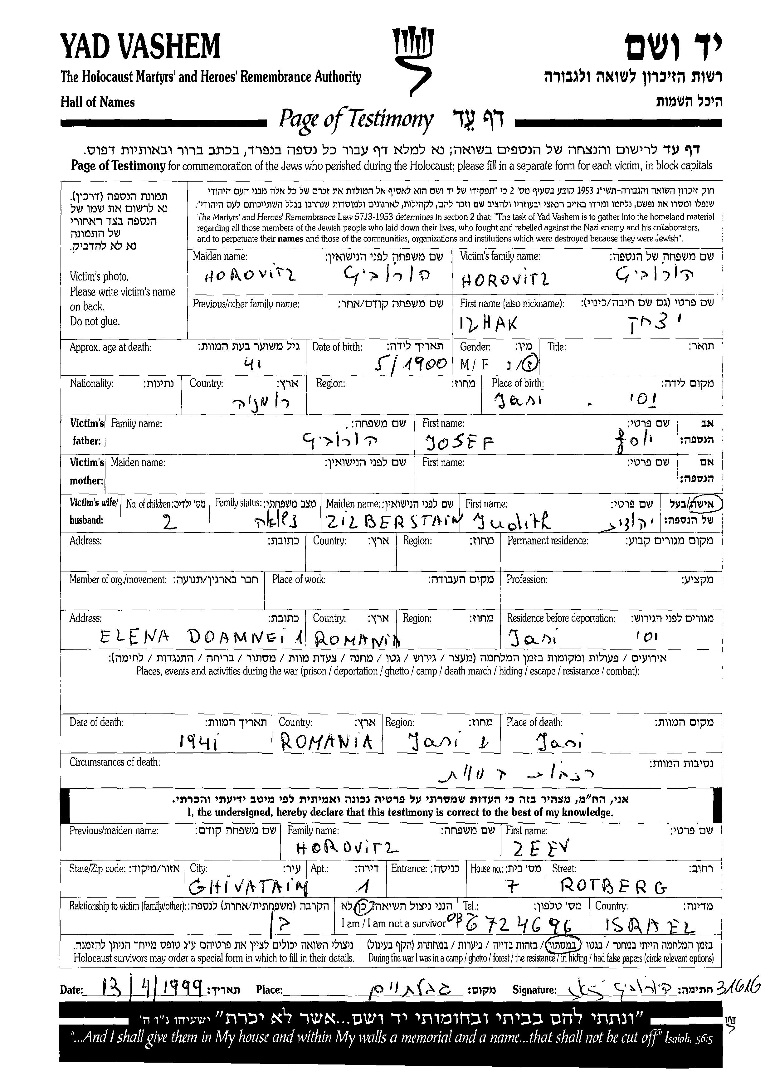 Ицхак Хоровиц, место рождения: Яссы, Румыния. Отец: Иосеф. Женат / замужем. Место во время войны: Яссы, Румыния.