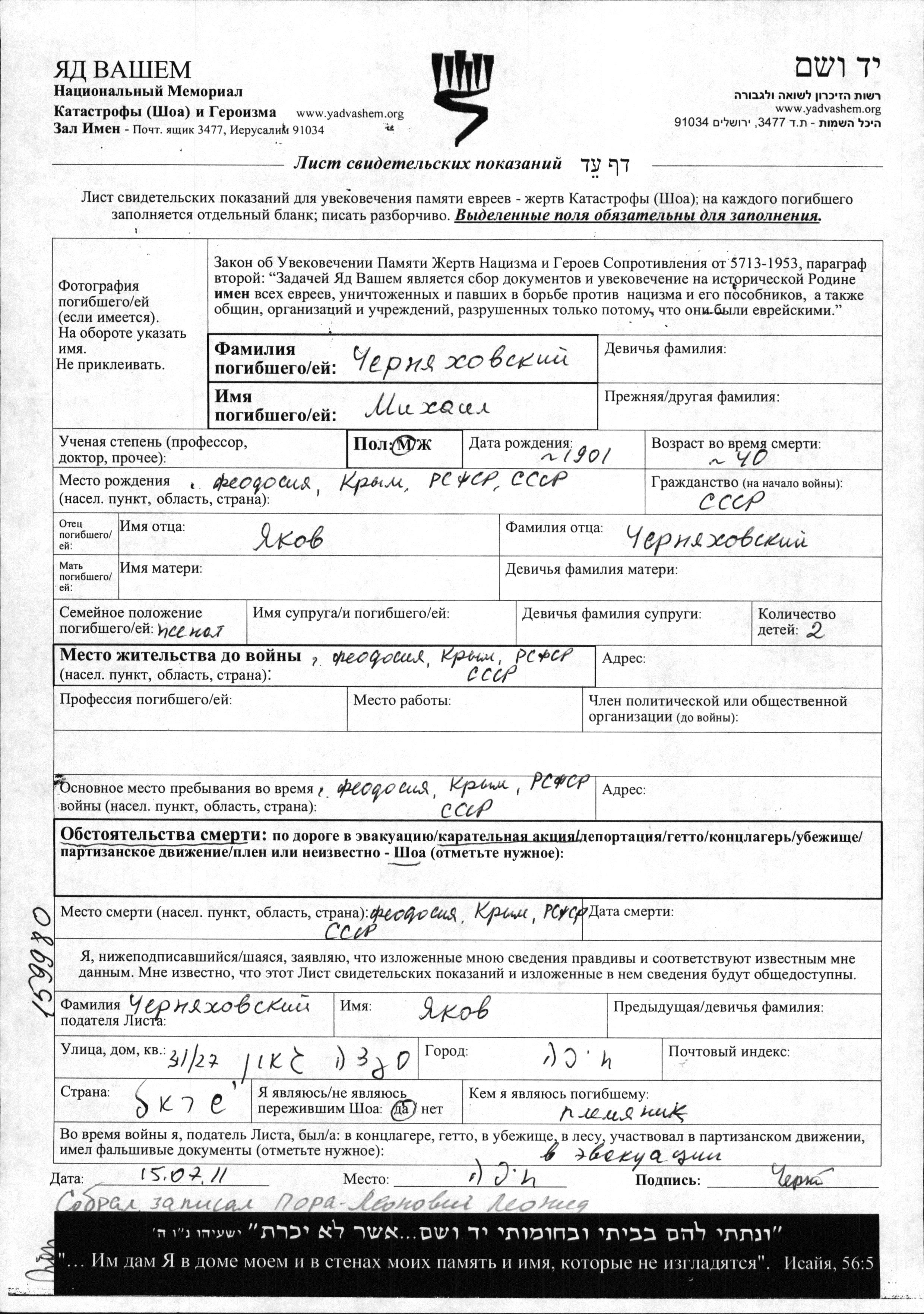 Черняховский Михаил 1901 Феодосия, Россия (СССР) Лист свидетельских показаний