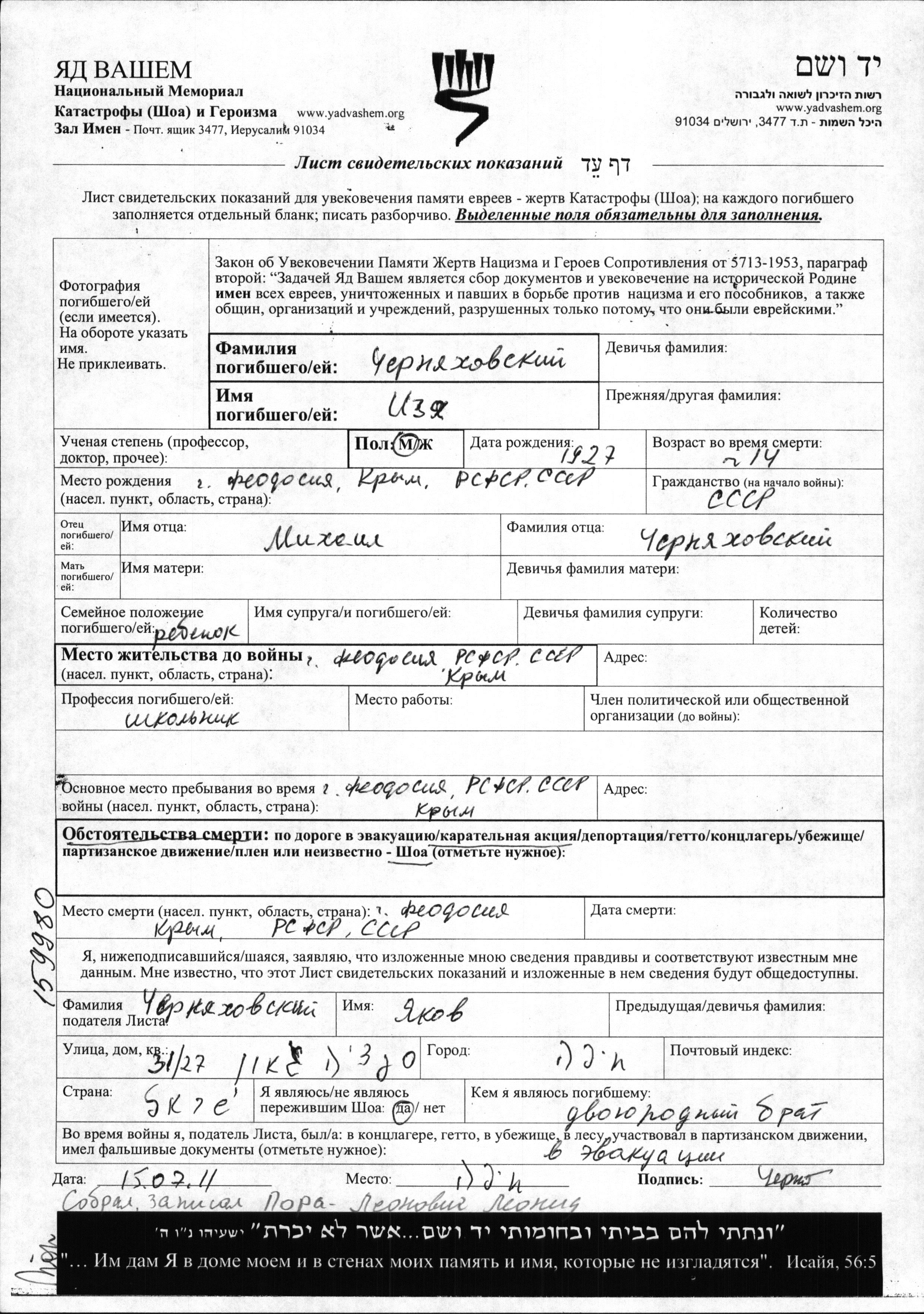 Черняховский Изя 1927 Феодосия, Россия (СССР) Лист свидетельских показаний