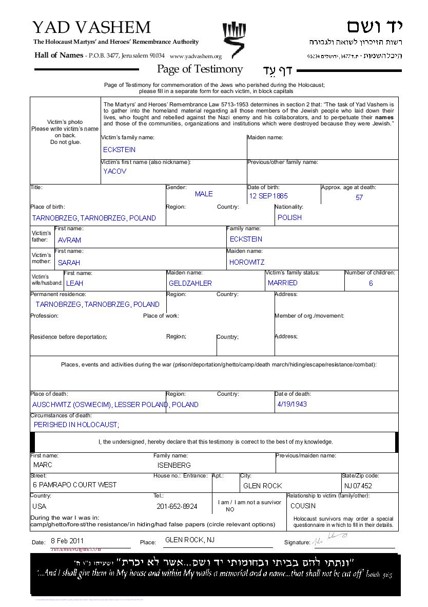 Яков Экштайн, место рождения: Тарнобжег, Польша. Отец: Аврам, mать:Сара, девичья фамилия Хоровиц. Женат / замужем. Место жительства до войны: Тарнобжег, Польша. Место во время войны: Тарнобжег, Польша.