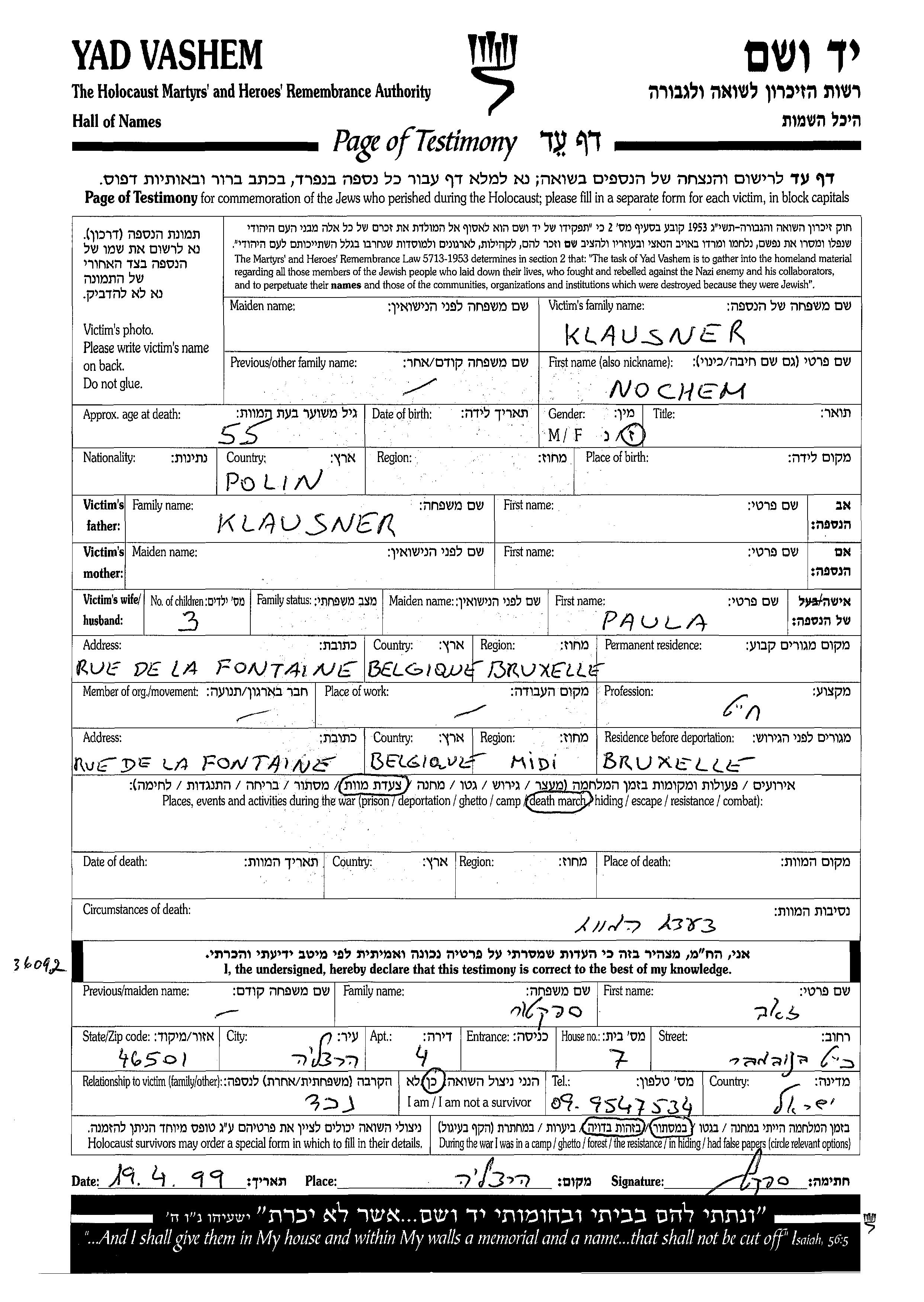 Клаузнер Нохем Брюссель, Бельгия Лист свидетельских показаний