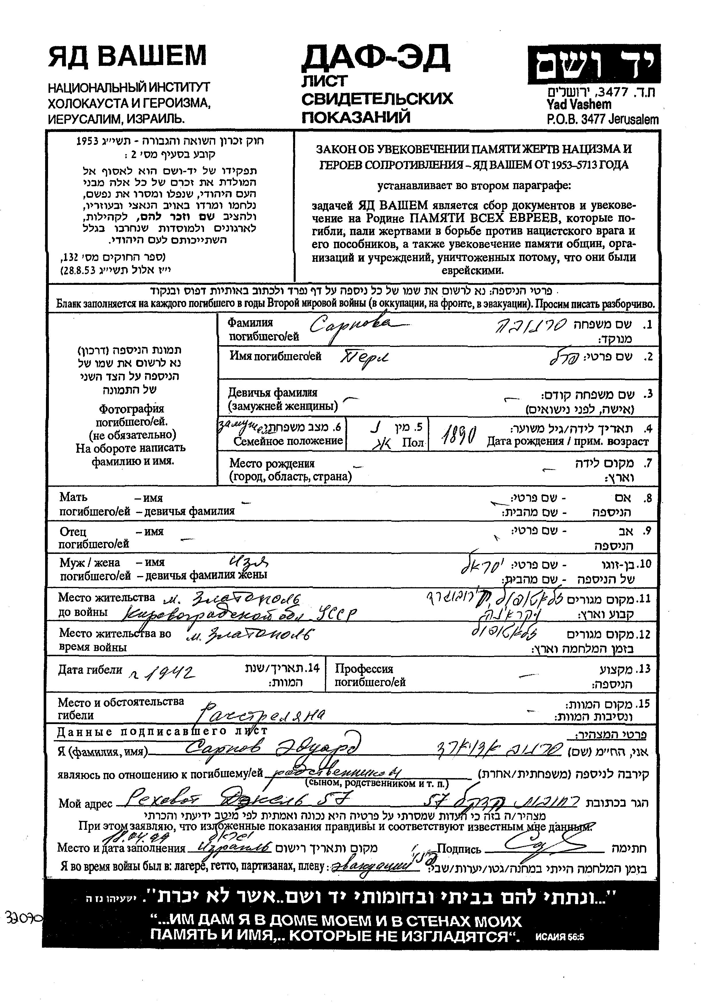 Сарнова Перл 1890 Златополь, Украина (СССР) Лист свидетельских показаний